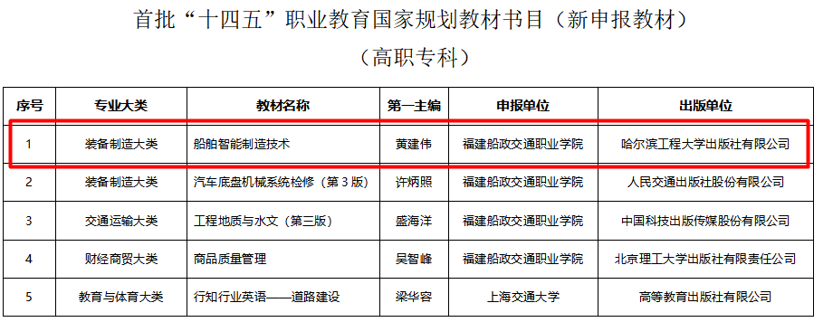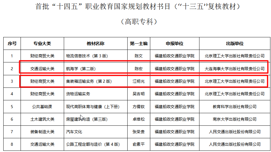 6月30日,教育部公布了首批“十四五”職業(yè)教育國家規(guī)劃教材書目,根據(jù)《“十四五”職業(yè)教育規(guī)劃教材建設(shè)實(shí)施方案》和《教育部辦公廳關(guān)于組織開展“十四五”首批職業(yè)教育國家規(guī)劃教材遴選工作的通知》要求,經(jīng)有關(guān)單位申報(bào)、形式審查、專家評審、專項(xiàng)審核、專家復(fù)核、面向社會(huì)公示等程序,共確定7251種教材入選首批“十四五”職業(yè)教育國家規(guī)劃教材(以下簡稱“十四五”國規(guī)教材),涵蓋全部19個(gè)專業(yè)大類、1382個(gè)專業(yè)。航海技術(shù)專業(yè)群入選三本,其中新申報(bào)入選1本,“十三五”復(fù)核教材入選兩本。