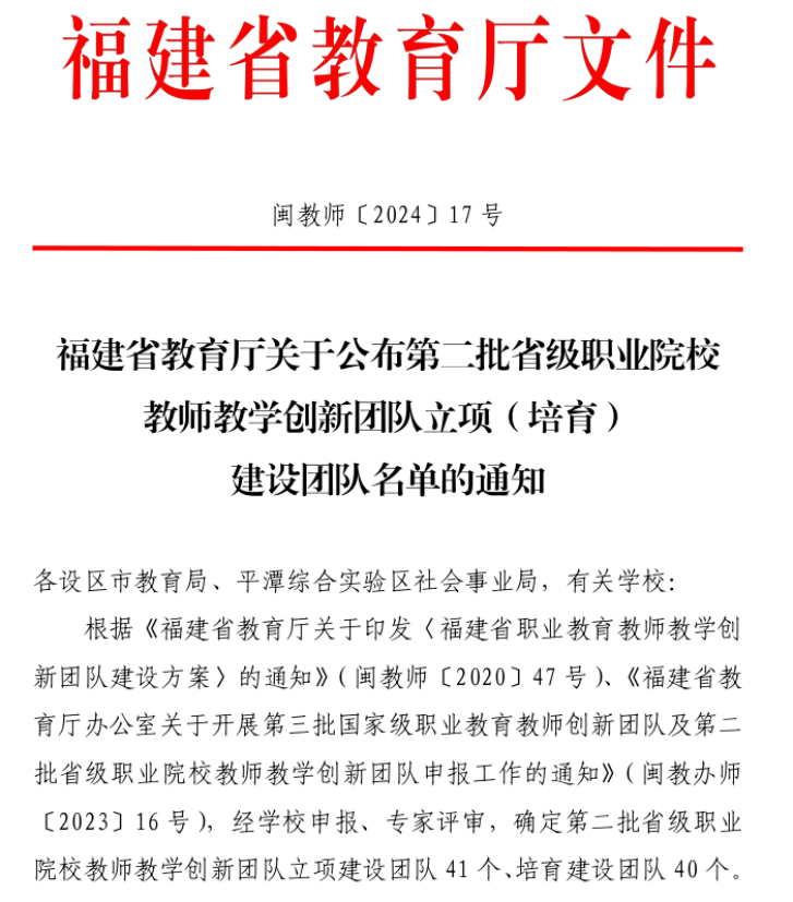 近日,福建省教育廳印發(fā)《關(guān)于公布第二批省級職業(yè)院校教師教學(xué)創(chuàng)新團隊立項(培育)建設(shè)團隊名單的通知》,確定第二批省級職業(yè)院校教師教學(xué)創(chuàng)新團隊立項建設(shè)團隊41個、培育建設(shè)團隊40個。我院船舶工程技術(shù)、新能源汽車技術(shù)、道路與橋梁工程技術(shù)等三個團隊入選省級職業(yè)院校教師教學(xué)創(chuàng)新團隊立項建設(shè)團隊。