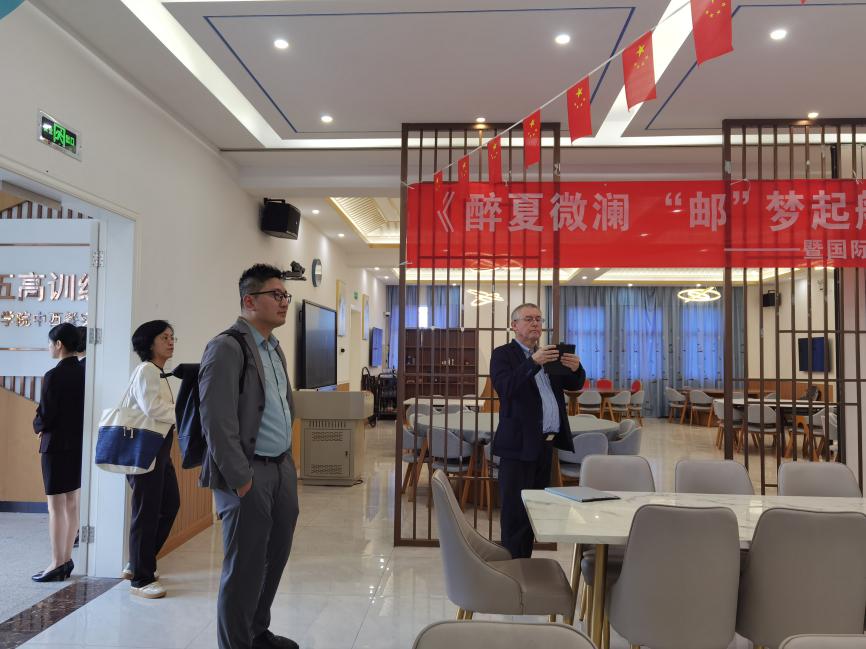 貝雷先生首先分別參觀了郵輪五高一期的中西餐實訓(xùn)室和二期的郵輪零售、郵輪客艙、中式茶藝實訓(xùn)室。在中西餐實訓(xùn)室中,先進(jìn)的烹飪設(shè)備和精致的餐具擺放,展示出專業(yè)的教學(xué)環(huán)境;郵輪零售實訓(xùn)室模擬真實的購物場景,讓學(xué)生提前感受郵輪商業(yè)氛圍;郵輪客艙實訓(xùn)室則高度還原了舒適的住宿環(huán)境;中式茶藝實訓(xùn)室散發(fā)著濃厚的文化氣息。貝雷先生認(rèn)真查看每一個實訓(xùn)室的設(shè)施設(shè)備,不時與陪同人員交流探討,對學(xué)院在專業(yè)實訓(xùn)方面的全面性和專業(yè)性給予了高度評價。
