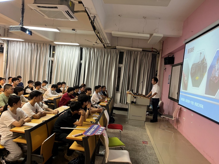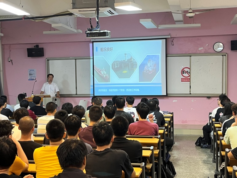 航海學院劉建安老師和外聘教師福建中平船務(wù)管理公司謝文勝輪機長,為新生們帶來了精彩的專業(yè)解讀。他們通過生動的案例、前沿的研究成果,深入淺出地講解了輪機工程技術(shù)專業(yè)的課程設(shè)置、學習方法、就業(yè)前景及行業(yè)發(fā)展趨勢,讓新同學們對即將深入學習的專業(yè)知識有了更加直觀和全面的認識。特別是在互動環(huán)節(jié),同學們積極提問,老師們耐心解答,現(xiàn)場氛圍活躍,充滿了求知的渴望和探索的熱情。