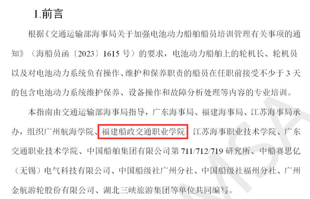 近日,為助力航運業(yè)綠色低碳轉(zhuǎn)型發(fā)展,保障電池動力船舶運營安全,提高電池動力船舶船員技能水平,交通運輸部海事局組織編寫的《電池動力船舶船員培訓(xùn)課程指南》(以下簡稱“《指南》”)正式發(fā)布,福建船政交通職業(yè)學(xué)院組織編寫團隊參與了《指南》“專業(yè)培訓(xùn)”部分的編寫工作,主要涉及電池動力系統(tǒng)操作與管理、電池動力系統(tǒng)應(yīng)急處理、維護與故障排查、直流配電系統(tǒng)組成與工作原理等培訓(xùn)內(nèi)容。