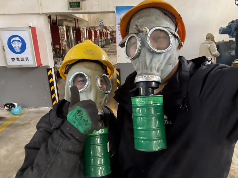 圖3:拆卸冷風(fēng)機(jī) 圖4:氨機(jī)房作業(yè)戴防毒面具