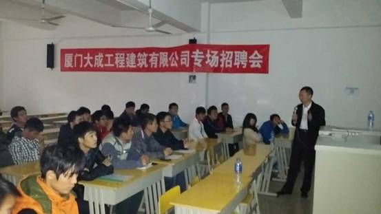 為進(jìn)一步做好我系2014屆畢業(yè)生就業(yè)工作,為畢業(yè)生求職和用人單位招聘人才搭建平臺(tái)、提供更好的服務(wù),我系于2013年12月10日下午2:30到5:30在信息系2-1教室召開(kāi)了廈門(mén)大成工程建設(shè)有限公司專場(chǎng)招聘會(huì)。