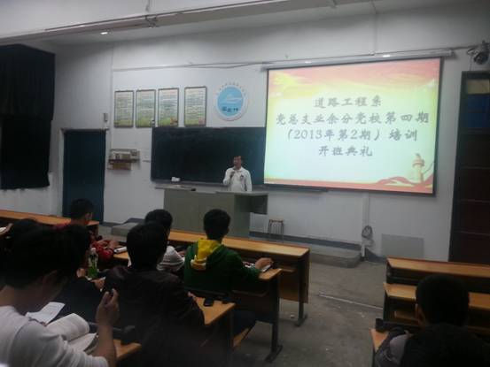 2013年10月28日晚上7:00,道路工程系黨總支業(yè)余分黨校第四期在土建樓二樓舉行入黨積極分子培訓(xùn)班開(kāi)班典禮。道路工程系王心金書(shū)記,曾新平輔導(dǎo)員, 11級(jí)第一批、第二批、第三批入黨積極分子共計(jì)16名學(xué)生參加了本次開(kāi)班典禮。