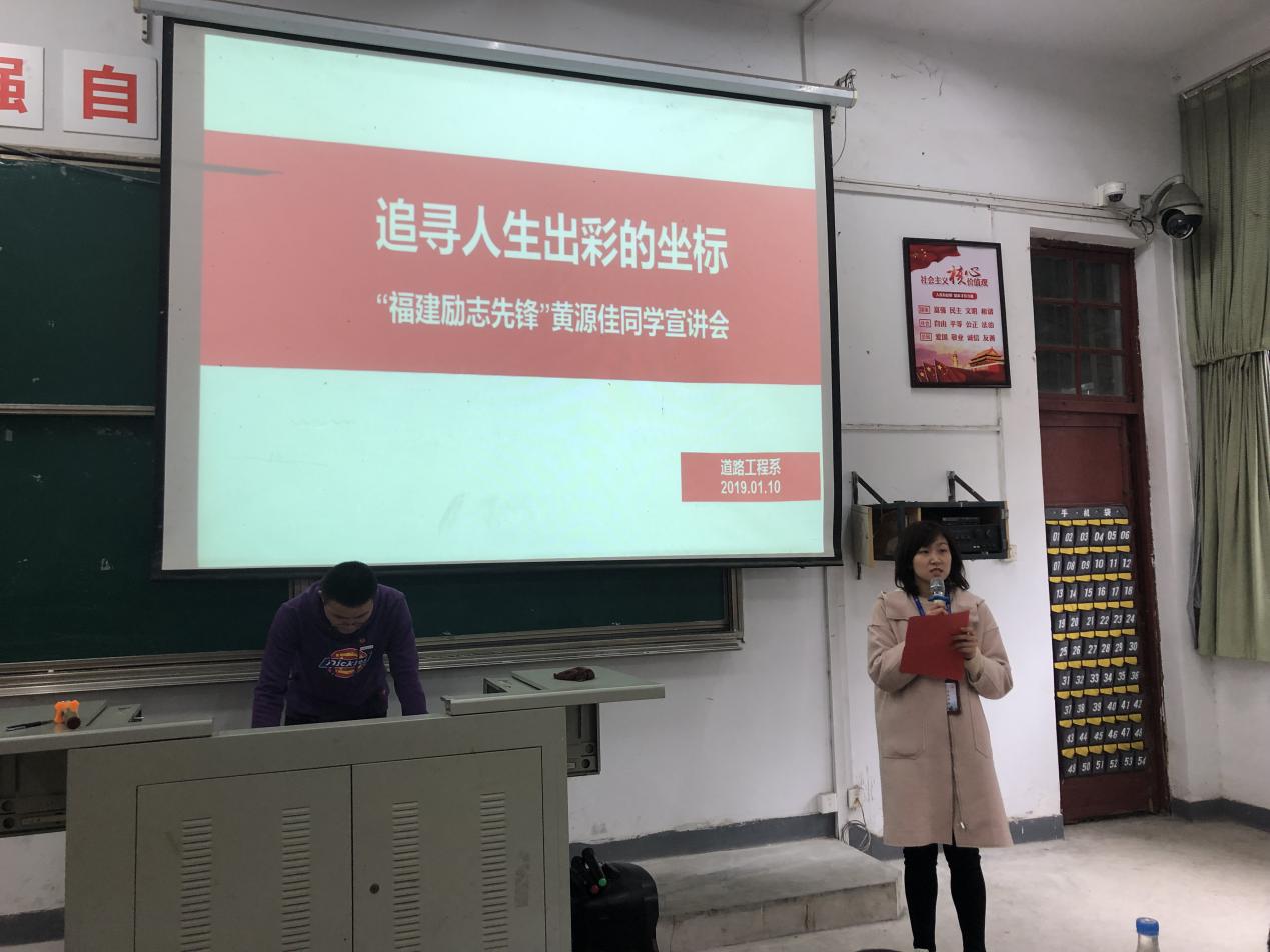 為了引導(dǎo)學(xué)生樹立崇高堅定的理想信念,養(yǎng)成執(zhí)著勤奮的學(xué)習(xí)態(tài)度,塑造奮發(fā)有為的精神氣質(zhì),2019年1月10日下午,道路工程系舉行了“尋求人生出彩坐標(biāo)”勵志先鋒黃源佳事跡宣講會。道路工程系黨總支書記江文老師、道路工程系全體輔導(dǎo)員和各班學(xué)生代表出席了宣講會。