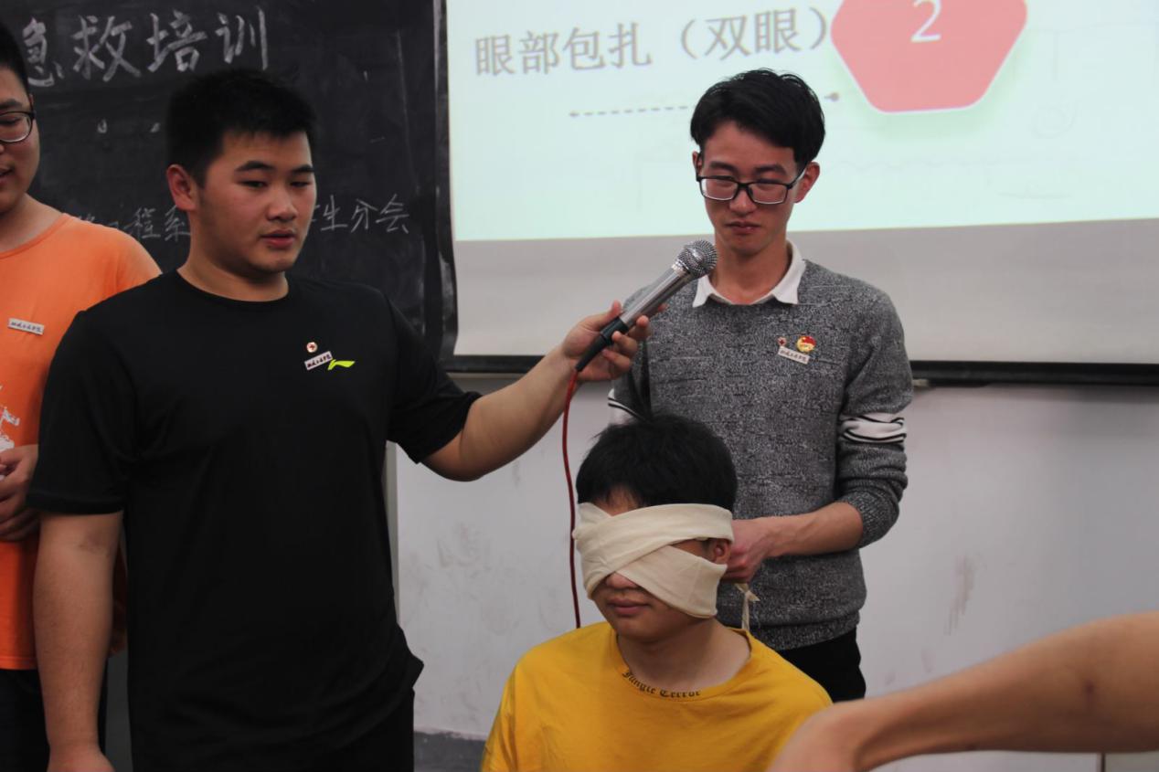 在培訓中,紅十字分會的成員為大家現(xiàn)場演示并講解了遭遇突發(fā)事故的現(xiàn)場急救:如何讓在搶救的黃金時間給生命垂危的人做心肺復蘇等。許多同學親身體驗了心肺復蘇、人工呼吸、包扎止血等的基本操作,并很快掌握了方法。此次培訓不但教授了現(xiàn)場救護方法,還介紹了其他自救知識,如:投,眼,臂,腿等不同部位的包扎方法,讓大家在輕松的氛圍中學會各種急救知識。