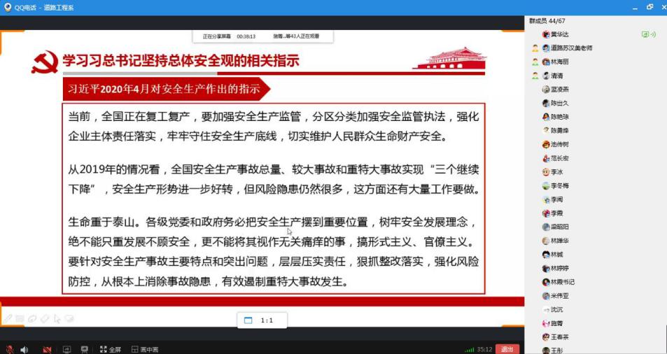 專題學(xué)習(xí)會議15:00開始,由林霞書記主持,黃華達(dá)老師主講,全體教職工通過QQ直播的方式參與。黃華達(dá)老師首先介紹了國家安全的內(nèi)容,危害國家安全的行為,如何維護(hù)國家安全等相關(guān)知識。其次,介紹了網(wǎng)絡(luò)安全法的制定、特點(diǎn)和公民的義務(wù)與權(quán)力。最后傳達(dá)了近期習(xí)總書記論堅(jiān)持總體國家安全觀的相關(guān)知識。