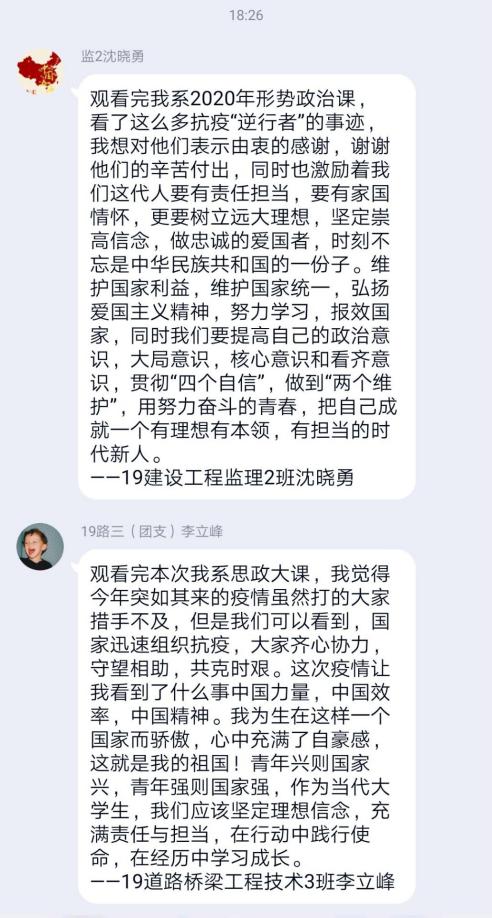 在本次的課程中看了這么多抗“疫”“逆行者”的事跡,我想對他們表示由衷的感謝,謝謝他們的辛苦付出,同時(shí)這次的事跡也激勵著我們這代人要有責(zé)任擔(dān)當(dāng),要有家國情懷,更要樹立遠(yuǎn)大理想,堅(jiān)定崇高信念,做忠誠的愛國者,時(shí)刻不忘自己是中華民族共和國的一份子。我們不僅要維護(hù)國家利益,維護(hù)國家統(tǒng)一,弘揚(yáng)愛國主義精神,努力學(xué)習(xí),報(bào)效國家,同時(shí),我們還要用努力奮斗的青春,把自己成就一個(gè)有理想、有本領(lǐng)、有擔(dān)當(dāng)?shù)臅r(shí)代新人?!?/span>19建設(shè)工程監(jiān)理2班沈曉勇