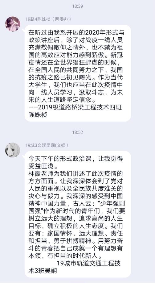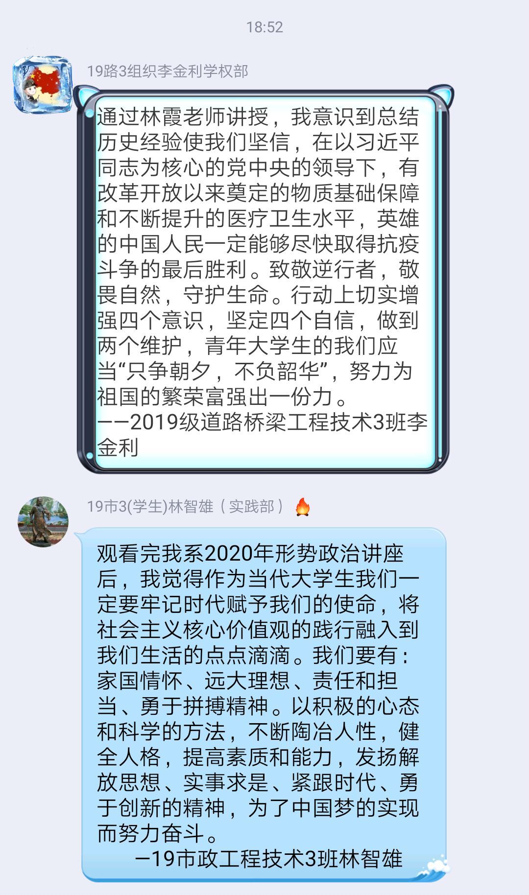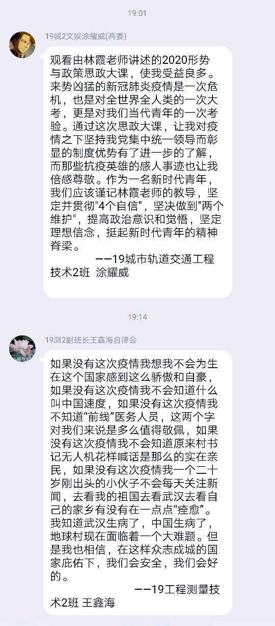 林霞書記為我們講述了此次疫情的方方面面。讓我深深體會到了黨對人民的重視以及全民族共度難關(guān)的決心與毅力。我深深的感受到中國精神中國力量,古人云:“少年強(qiáng)則國強(qiáng)”作為新時(shí)代的青年們,我們要樹立遠(yuǎn)大的理想,追求高尚的人生目標(biāo),確立積極的人生態(tài)度。我們要有:家國情懷、遠(yuǎn)大理想、責(zé)任和擔(dān)當(dāng)、勇于拼搏精神。用努力奮斗的青春把自己成就一個(gè)有理想有本領(lǐng),有擔(dān)當(dāng)?shù)臅r(shí)代新人。 —— 2019級城市軌道交通工程技術(shù)3班吳嫻