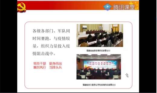 本次課程共分為三個(gè)部分,第一部分為這段時(shí)間我們經(jīng)歷了什么?通過翻開日歷與學(xué)生一起回放疫情發(fā)生后黨中央高度重視,習(xí)近平總書記親自指揮,全國一盤棋,聯(lián)防聯(lián)控集中力量辦大事,全國人民守望相助,共克時(shí)艱歷程,中國能在較短時(shí)間內(nèi)有效遏制住疫情的蔓延,體現(xiàn)出中國力量、中國精神、中國效率,充分彰顯了中國共產(chǎn)黨有力的領(lǐng)導(dǎo)和中國制度、依靠人民群眾抗擊疫情等顯著的優(yōu)勢,激發(fā)同學(xué)們的愛國情懷、堅(jiān)定戰(zhàn)“疫”必勝信心、樹立人類命運(yùn)共同體理念。在第二部分我們看到什么?透過全球戰(zhàn)“疫”烽煙使我們真切地感受到:正是有了中國共產(chǎn)黨這個(gè)總攬全局、協(xié)調(diào)各方的領(lǐng)導(dǎo)核心,中國社會集中力量辦大事就有了“主心骨”、有了方向感、有了向心力。課程中還結(jié)合抗“疫”過程習(xí)總書記和黨中央始終把人民生命安全放在首位,中共產(chǎn)黨員挺身而出,基層黨組織發(fā)揮了堡壘作用,全民動員,齊心協(xié)力,馳援“逆行者”無畏擔(dān)當(dāng)?shù)孽r活的例子,讓同學(xué)們感受到中國人民的不屈不撓的精神和仁心大愛與責(zé)任擔(dān)當(dāng)。第三部分我們應(yīng)該做什么?中林霞書記要求同學(xué)們要懂得在經(jīng)歷中學(xué)習(xí)和成長,要有堅(jiān)定理想信念,責(zé)任擔(dān)當(dāng),并從行動中踐行,增強(qiáng)“四個(gè)意識”,堅(jiān)定“四個(gè)自信”,做到“兩個(gè)維護(hù)”,要有家國情懷、遠(yuǎn)大理想、責(zé)任和擔(dān)當(dāng)、勇于拼搏精神,要用奮斗的青春,把自己成就為一個(gè)有理想、有本領(lǐng)、有擔(dān)當(dāng)?shù)臅r(shí)代新人。