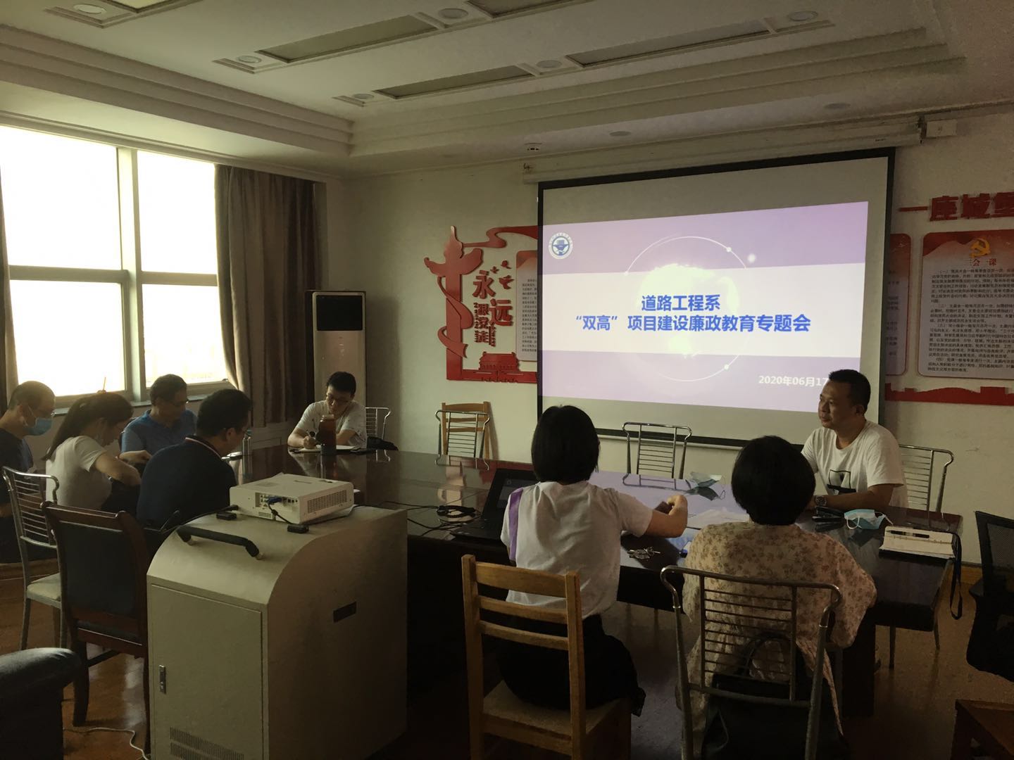 2020年6月17日,道路工程系系主任高教授組織部分有“雙高”實(shí)驗(yàn)實(shí)訓(xùn)室建設(shè)任務(wù)的教師在高區(qū)科技樓1009辦公室召開“雙高”項(xiàng)目建設(shè)廉政教育專題會(huì)。會(huì)議由黃穎副主任主持。