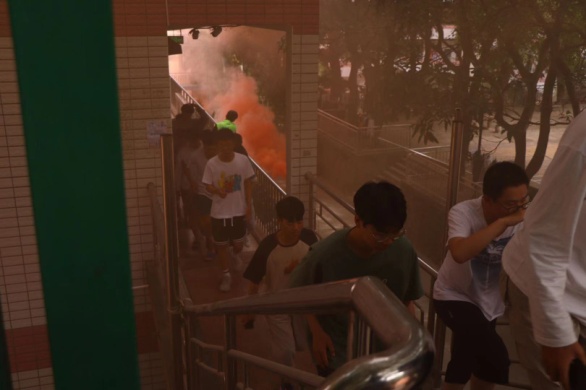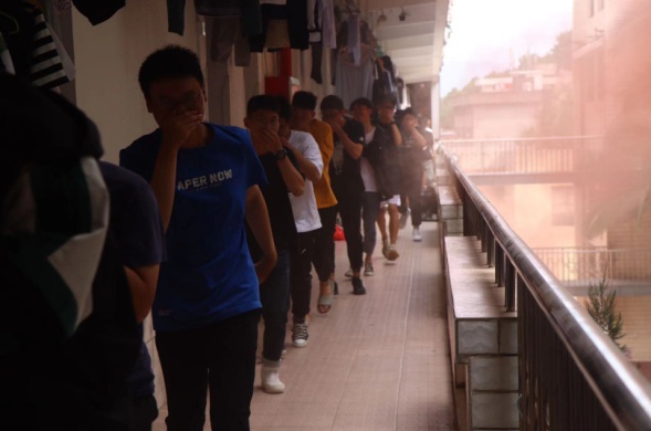 中午12:00,隨著悠長(zhǎng)的警鈴聲響起,各班學(xué)生在負(fù)責(zé)人的指揮下彎著腰,貓著步,捂住口鼻,沿著指定樓梯口快速前進(jìn),有序撤離到安全地帶。