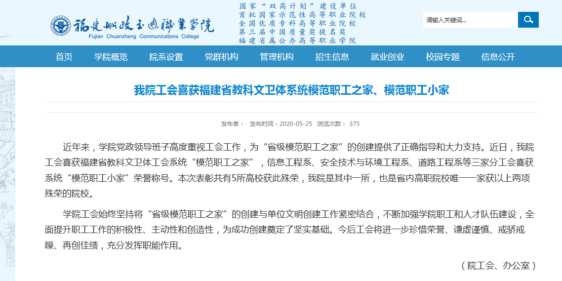 近年來,學(xué)院黨政領(lǐng)導(dǎo)班子高度重視工會工作,為“省級模范職工之家”的創(chuàng)建提供了正確指導(dǎo)和大力支持。近日,我院工會喜獲福建省教科文衛(wèi)體工會系統(tǒng)“模范職工之家”,信息工程系、安全技術(shù)與環(huán)境工程系、道路工程系等三家分工會喜獲系統(tǒng)“模范職工小家”榮譽(yù)稱號。本次表彰共有5所高校獲此殊榮,我院是其中一所,也是省內(nèi)高職院校唯一一家獲以上兩項(xiàng)殊榮的院校。