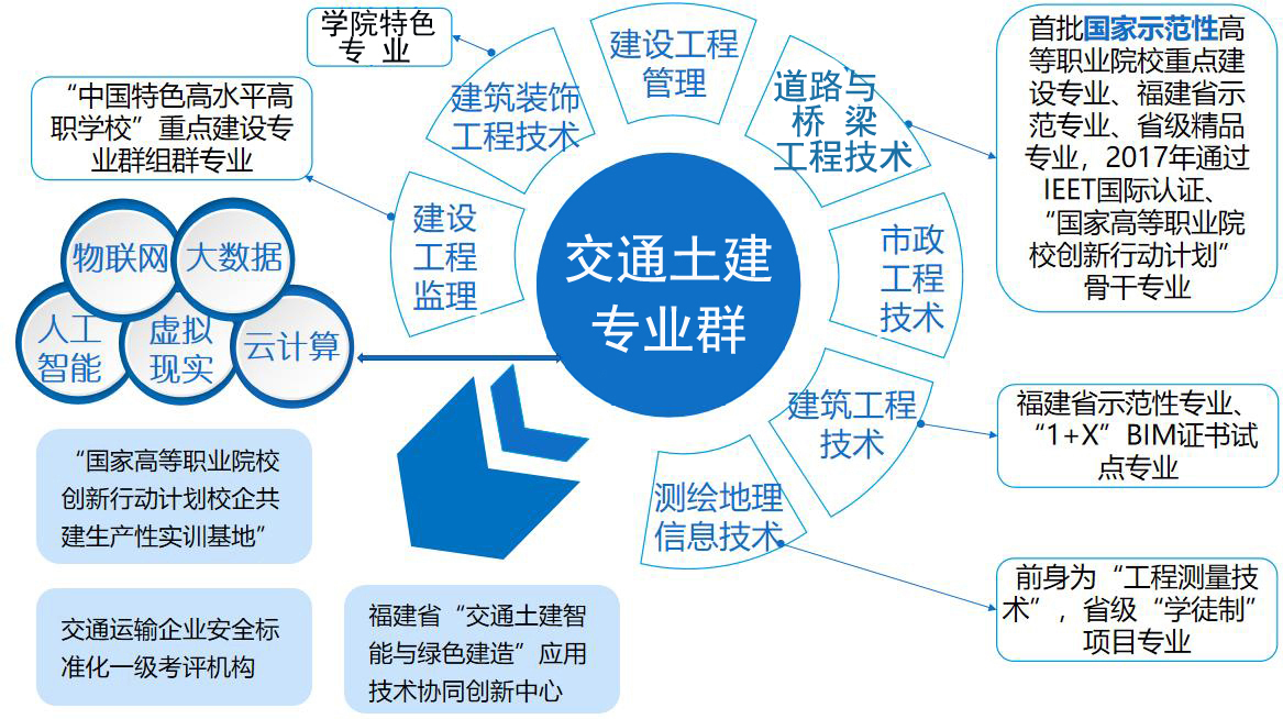 目前,土木工程學(xué)院招生的專(zhuān)業(yè)有道路與橋梁工程技術(shù)、市政工程技術(shù)、建設(shè)工程監(jiān)理、測(cè)繪與地理信息技術(shù)、建筑工程技術(shù)、建設(shè)工程管理、建筑裝飾工程技術(shù)等7個(gè)專(zhuān)業(yè)。其中,道路與橋梁工程技術(shù)是首批國(guó)家示范性高等職業(yè)院校建設(shè)計(jì)劃中央財(cái)政重點(diǎn)支持建設(shè)的專(zhuān)業(yè)(簡(jiǎn)稱(chēng)“國(guó)家示范校重點(diǎn)專(zhuān)業(yè)”)、國(guó)家創(chuàng)新發(fā)展行動(dòng)計(jì)劃骨干專(zhuān)業(yè)、福建省示范專(zhuān)業(yè)、福建省精品專(zhuān)業(yè),“福建省雙高”重點(diǎn)建設(shè)專(zhuān)業(yè)群的核心專(zhuān)業(yè),2017年通過(guò)IEET國(guó)際認(rèn)證;建設(shè)工程監(jiān)理專(zhuān)業(yè)是“中國(guó)特色高水平高職學(xué)校與高水平專(zhuān)業(yè)建設(shè)計(jì)劃”(簡(jiǎn)稱(chēng)“國(guó)家雙高”)高水平專(zhuān)業(yè)群的組群專(zhuān)業(yè);市政工程技術(shù)、測(cè)繪與地理信息技術(shù)、建設(shè)工程管理專(zhuān)業(yè)是“福建省雙高”重點(diǎn)建設(shè)專(zhuān)業(yè)群(道路與橋梁工程技術(shù)專(zhuān)業(yè)群)的組群專(zhuān)業(yè);建筑工程技術(shù)是福建省示范專(zhuān)業(yè);建筑裝飾工程技術(shù)為學(xué)校特色專(zhuān)業(yè)。