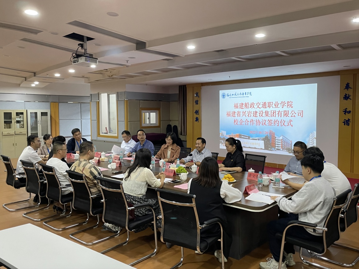 2022年10月20日下午,為了深入推進(jìn)產(chǎn)教融合、校企合作,提升人才培養(yǎng)質(zhì)量,福建船政交通職業(yè)學(xué)院與福建省興巖建設(shè)集團(tuán)有限公司舉行校企合作協(xié)議簽訂并授牌儀式。本次簽約授牌儀式在創(chuàng)新樓1007舉行,出席的企業(yè)代表有總經(jīng)理葉永斌、副總經(jīng)理張麗嬪、總工程師鄭東明等其他企業(yè)部門(mén)負(fù)責(zé)人,校方代表有張祖柱副院長(zhǎng),土木工程學(xué)院黨政領(lǐng)導(dǎo)及專(zhuān)業(yè)帶頭人。