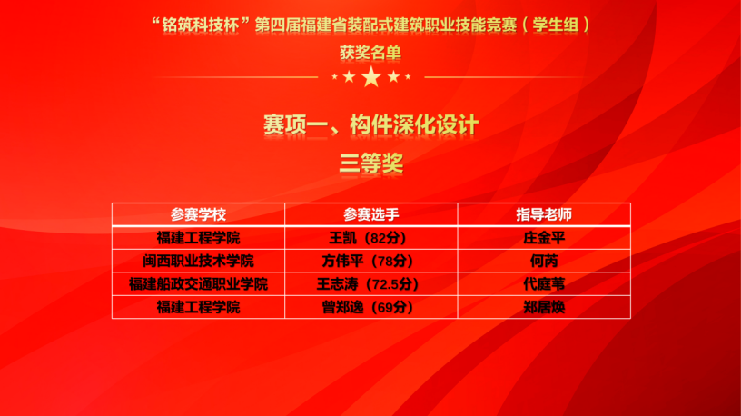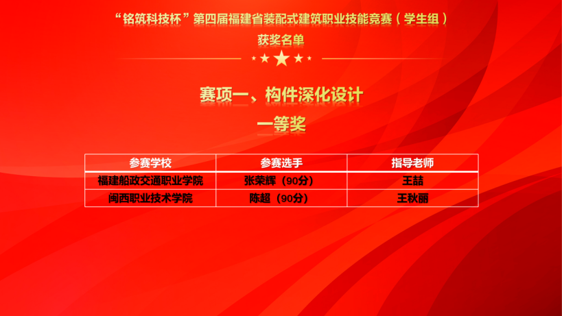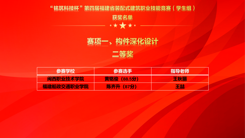在本項(xiàng)賽事中,我院共有6名選手參加深化設(shè)計(jì)和構(gòu)件制作與安裝兩個(gè)賽項(xiàng)的比賽,其中選手20級(jí)建筑工程技術(shù)專業(yè)張榮輝同學(xué)在王喆、代庭葦、高巧玲等裝配式建筑教師團(tuán)隊(duì)的指導(dǎo)下,在深化設(shè)計(jì)賽項(xiàng)中勇奪桂冠,榮獲一等獎(jiǎng)。陳齊升同學(xué)和王志濤同學(xué)分別榮獲深化設(shè)計(jì)二等獎(jiǎng)和三等獎(jiǎng),葉紹龍同學(xué)榮獲構(gòu)件制作與安裝賽項(xiàng)三等獎(jiǎng)。