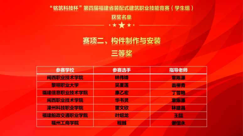 2022年11月12日,第五屆全國裝配式建筑職業(yè)技能競(jìng)賽“裝配式建筑施工員”賽項(xiàng)福建省選拔賽暨“銘筑科技杯”第四屆福建省裝配式建筑職業(yè)競(jìng)賽在福建船政交通職業(yè)學(xué)院成功舉辦。因疫情原因,本項(xiàng)賽事學(xué)生組通過線上競(jìng)賽的形式進(jìn)行,福建省10所院校(包括本科、高職等各類院校)共計(jì)42名選手參加本項(xiàng)賽事。