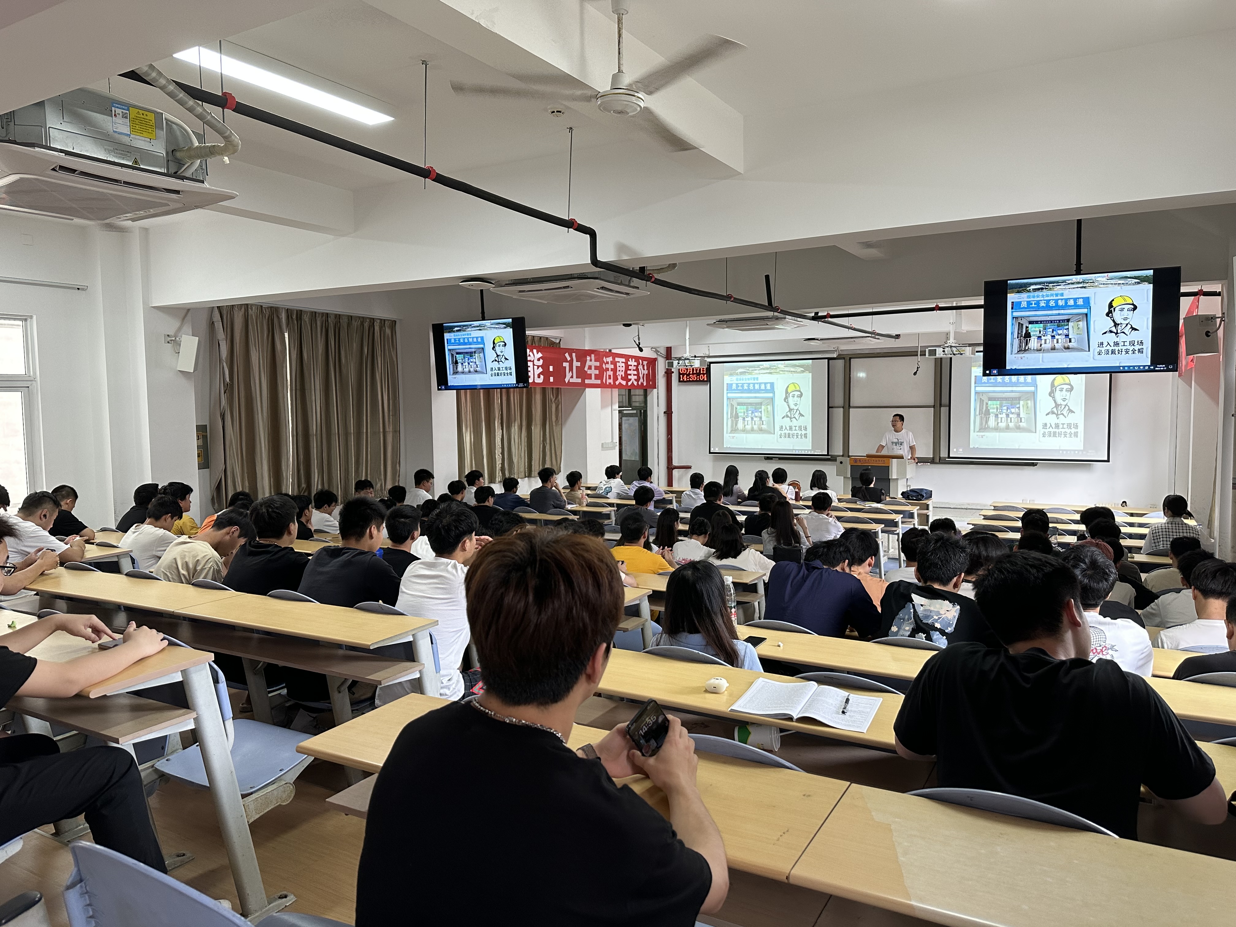 謝仁波圍繞“建筑施工的特點(diǎn)”、“現(xiàn)場(chǎng)安全如何管理”、“標(biāo)化工地的創(chuàng)建”、“通過創(chuàng)優(yōu)工程快速提升自己”、 “工地萊鳥如何成長(zhǎng)”等問題進(jìn)行深刻闡釋。謝仁波以過來人的身份向?qū)W弟學(xué)妹們介紹了他個(gè)人工作履歷,分享了工作后的部分參建項(xiàng)目案例,再結(jié)合上述內(nèi)容,對(duì)學(xué)生在校期間生活學(xué)習(xí)、工作后各方面給予建議,最后與學(xué)生進(jìn)行互動(dòng)溝通。