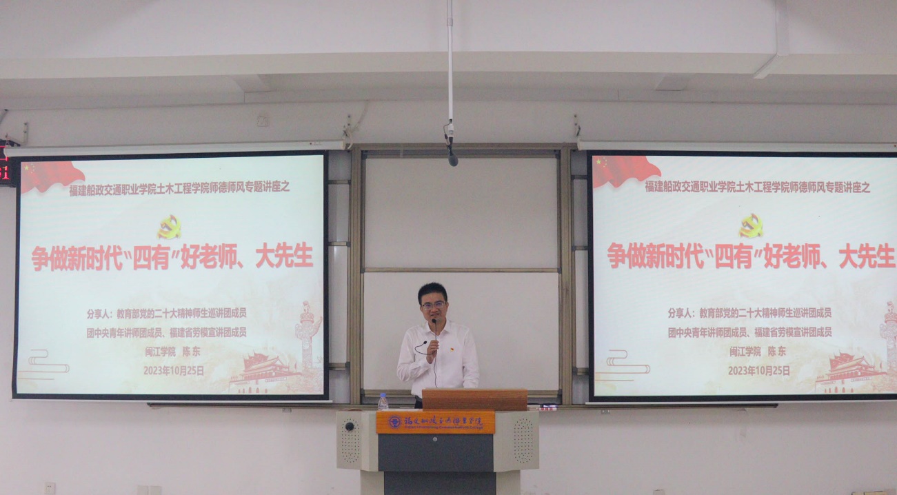 為深入貫徹落實(shí)黨的二十大精神,用習(xí)近平新時(shí)代中國(guó)特色社會(huì)主義思想鑄魂育人,進(jìn)一步增強(qiáng)教師的責(zé)任感、使命感、榮譽(yù)感,規(guī)范職業(yè)行為,明確師德底線,引導(dǎo)廣大教師努力成為有理想信念、有道德情操、有扎實(shí)學(xué)識(shí)、有仁愛(ài)之心的好老師,2023年10月25日下午,土木工程學(xué)院舉辦2023年“躬耕教壇修師德 教育強(qiáng)國(guó)鑄師魂”師德模范講座,邀請(qǐng)全國(guó)模范教師陳東副教授作《爭(zhēng)做新時(shí)代“四有”好老師、大先生》專(zhuān)題報(bào)告。