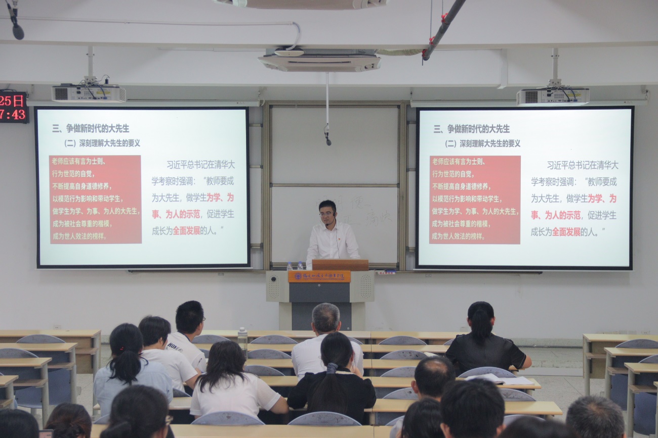 陳東副教授以“爭(zhēng)做新時(shí)代‘四有’好老師、大先生”為主題,從“有了愛(ài)就有了一切”看師德師風(fēng)、樹(shù)立“四有”好老師標(biāo)準(zhǔn)、爭(zhēng)做新時(shí)代的大先生三個(gè)方面展開(kāi),通過(guò)身邊一個(gè)個(gè)鮮活的故事,通俗易懂的語(yǔ)言,闡釋了師德的重要意義及達(dá)成“四有”好老師的成長(zhǎng)途徑,激發(fā)教師的責(zé)任意識(shí)。在講座中,陳東帶領(lǐng)大家重溫黨的二十大報(bào)告中“教育、科技、人才是全面建設(shè)社會(huì)主義現(xiàn)代化國(guó)家的基礎(chǔ)性、戰(zhàn)略性支撐” “培養(yǎng)什么人、怎樣培養(yǎng)人、為誰(shuí)培養(yǎng)人是教育的根本問(wèn)題。育人的根本在于立德”等重要論述,進(jìn)一步激發(fā)大家要以德立身、以德立學(xué)、以德施教,堅(jiān)持為黨育人、為國(guó)育才的使命和擔(dān)當(dāng)。