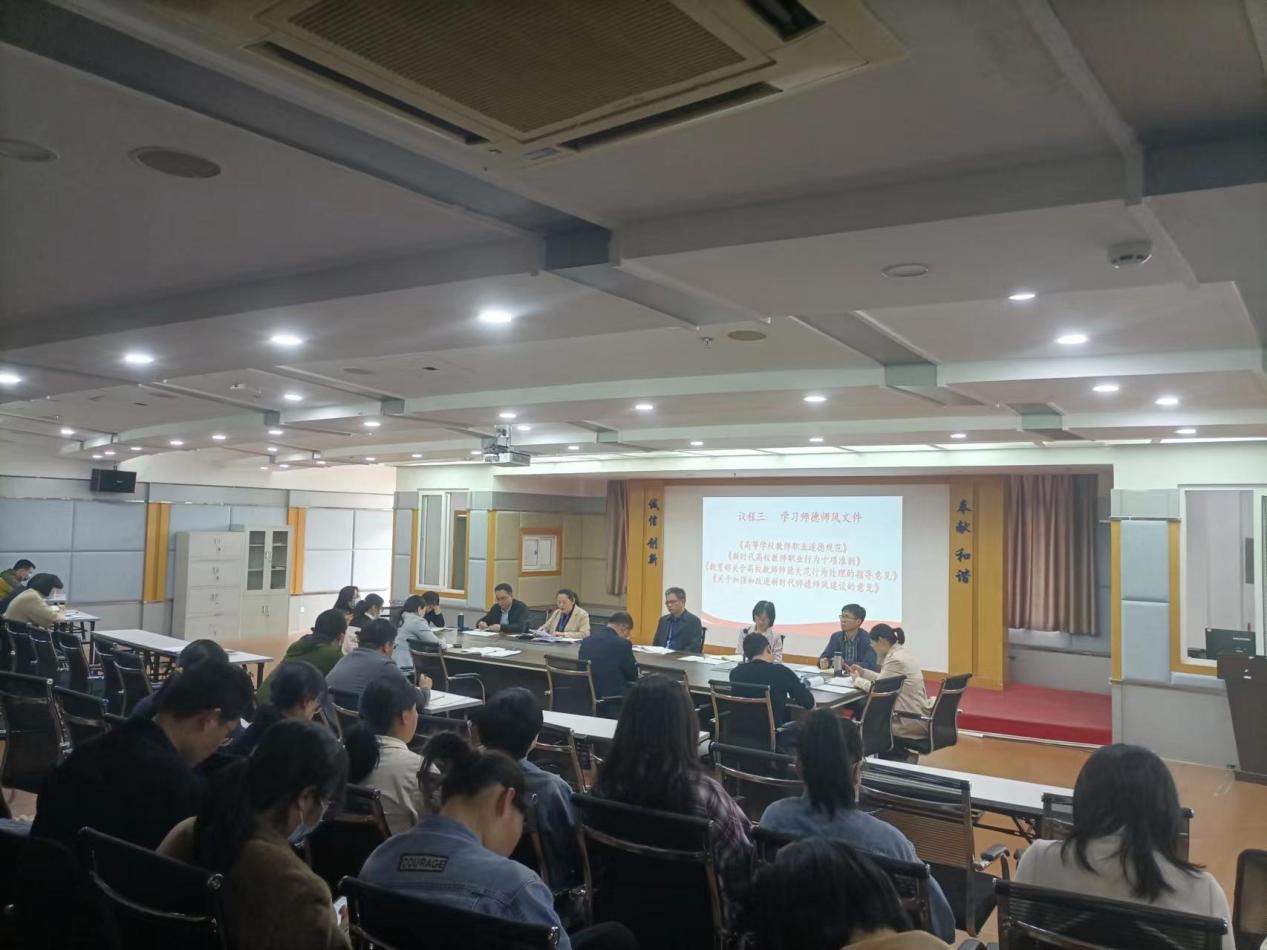 會(huì)上,首先集中學(xué)習(xí)了習(xí)近平總書記在中央政治局進(jìn)行第五次集體學(xué)習(xí)上發(fā)表的重要講話精神、習(xí)近平致全國優(yōu)秀教師代表的信、《高等學(xué)校教師職業(yè)道德規(guī)范》《新時(shí)代高校教師職業(yè)行為十項(xiàng)準(zhǔn)則》《教育部關(guān)于高校教師師德失范行為處理的指導(dǎo)意見》《關(guān)于加強(qiáng)和改進(jìn)新時(shí)代師德師風(fēng)建設(shè)的意見》,通報(bào)了《教育部曝光7起違反教師職業(yè)行為十項(xiàng)準(zhǔn)則典型案例》。