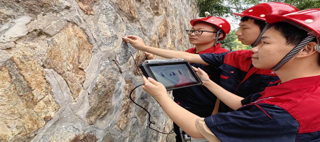 本次活動(dòng)中,團(tuán)隊(duì)成員現(xiàn)場調(diào)研當(dāng)?shù)卮迓涫鲶w建筑現(xiàn)狀,并與當(dāng)?shù)卮迕衩鎸γ娼涣鲗?,掌握村民對石砌體建筑抗震加固的需求。同時(shí)利用專業(yè)檢測設(shè)備對石厝灰縫進(jìn)行無損探測,收集到灰縫缺陷情況。