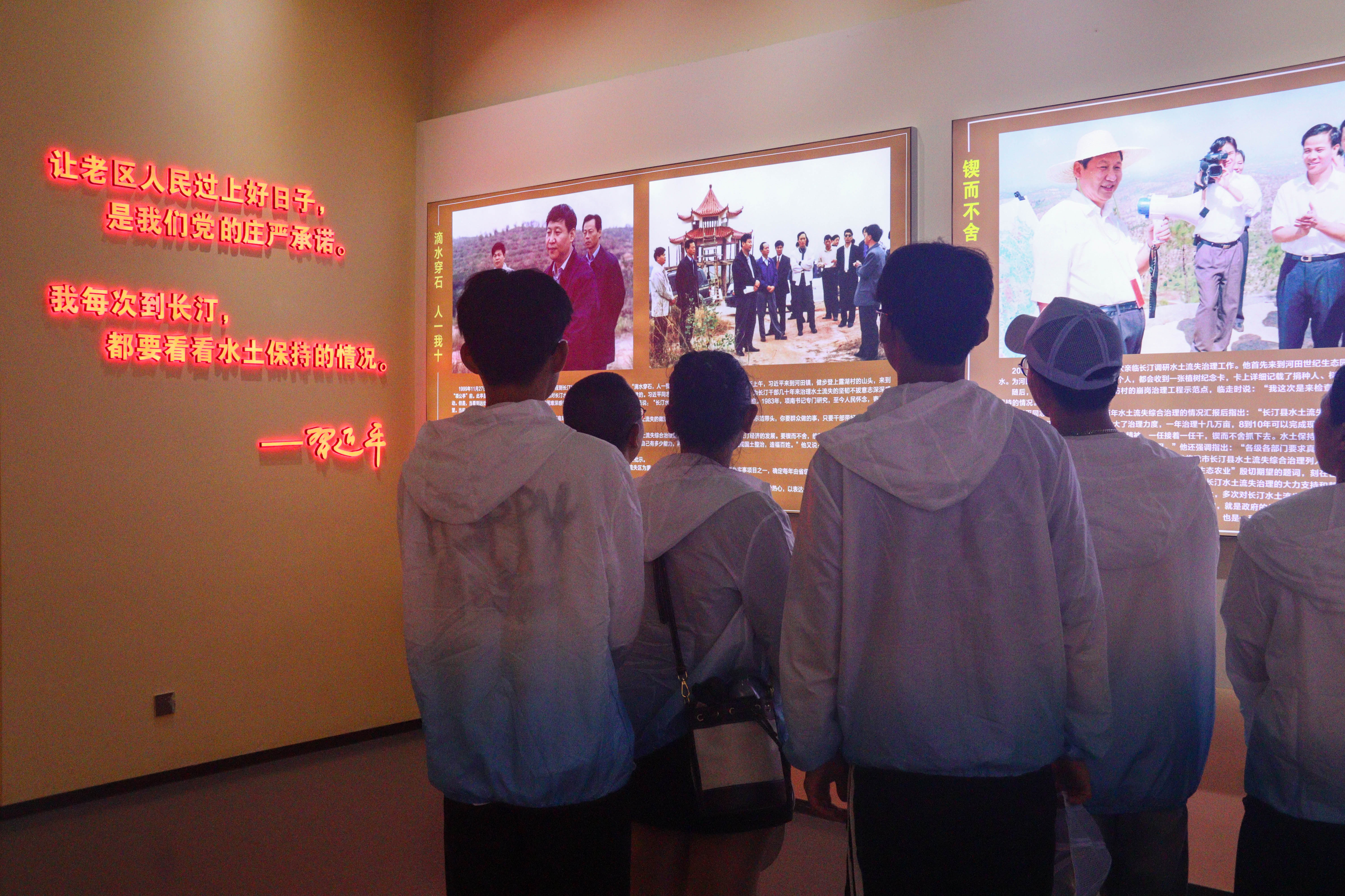 這是在長汀縣水土保持園科教館“青山作證”的展廳中,現(xiàn)場講解員正在給師生講解。展廳中的每一張照片、每一段文字,仿佛都在講述著長汀縣在習(xí)近平總書記帶領(lǐng)下治理水土流失的發(fā)展歷程,師生們仿佛走進(jìn)了那段艱難歲月,感受長汀縣從“濁水荒山”到“綠水青山”,再到“金山銀山”的歷史性變化,重溫著習(xí)近平總書記“五次到長汀”對(duì)水土流失治理工作“進(jìn)則全勝、不進(jìn)則退”的諄諄囑托,深刻詮釋了“四下基層”的工作作風(fēng)。