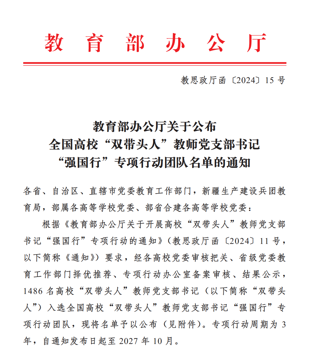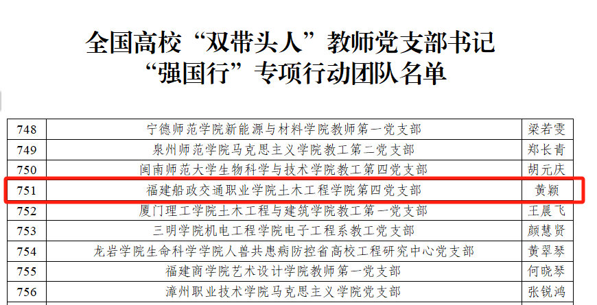 近日,教育部辦公廳公布了全國高?!半p帶頭人”教師黨支部書記“強(qiáng)國行”專項(xiàng)行動團(tuán)隊(duì)名單,土木工程學(xué)院第四黨支部(負(fù)責(zé)人:黃穎)入選全國高校“雙帶頭人”教師黨支部書記“強(qiáng)國行”專項(xiàng)行動團(tuán)隊(duì)。