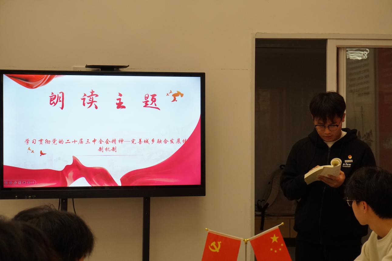 分享會(huì)上,2024級(jí)建筑工程技術(shù)3班班長江順,土木工程學(xué)院實(shí)踐部成員,領(lǐng)學(xué)朗讀了《中共中央關(guān)于進(jìn)一步全面深化改革、推進(jìn)中國式現(xiàn)代化的決定》(后文簡(jiǎn)稱《決定》)“完善城鄉(xiāng)融合發(fā)展體制機(jī)制”部分。
