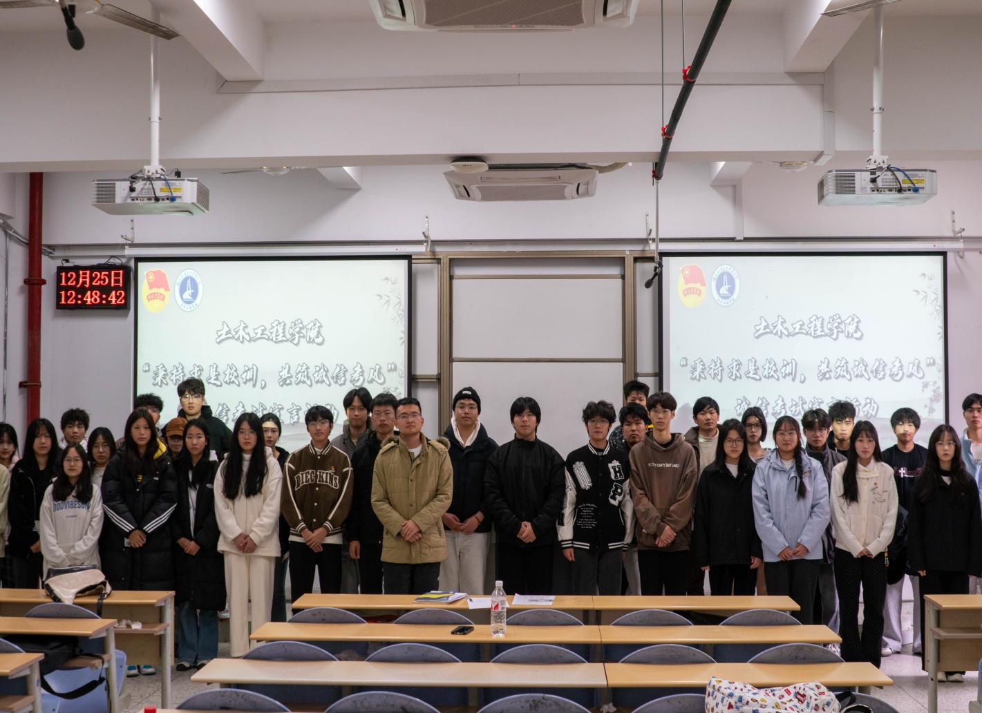 為貫徹落實習(xí)近平總書記關(guān)于誠信建設(shè)的重要批示精神,提高學(xué)生的誠信意識,維護考試競爭的公平性。2024年12月25日,土木工程學(xué)院于福船園創(chuàng)新樓302教室開展“秉持求是校訓(xùn),共筑誠信考風(fēng)”誠信考試宣誓活動,各班學(xué)習(xí)委員以及學(xué)生代表參與本次活動。