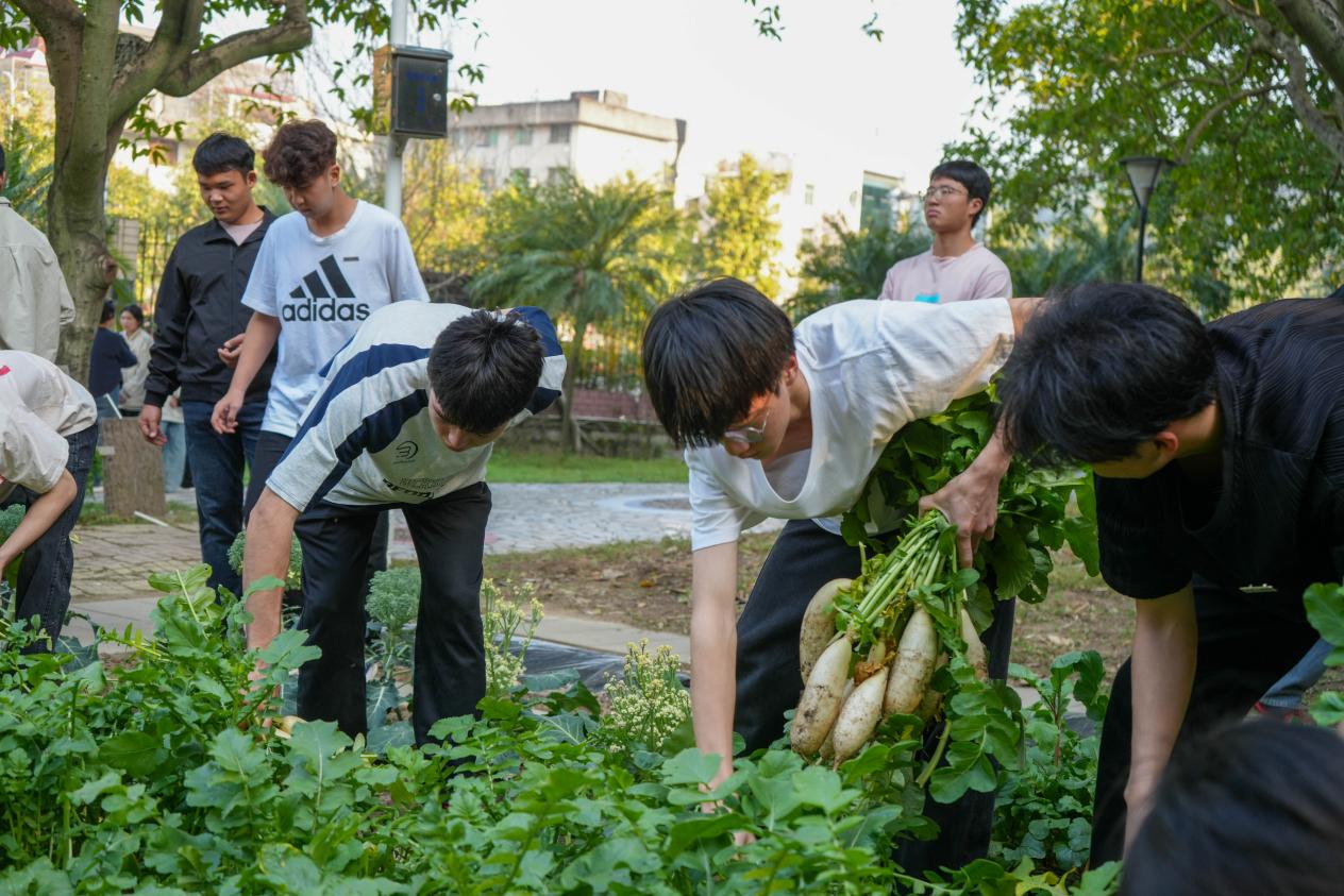 隨著收獲季節(jié)的到來,農(nóng)場里的蘿卜、西蘭花等蔬果迎來了大豐收。大片翠綠的蘿卜纓隨風(fēng)輕舞,仿佛在向師生們發(fā)出豐收的邀請。師生們手持農(nóng)具,彎腰勞作,開啟收獲之旅。不一會兒,一個個潔白飽滿的蘿卜破土而出。