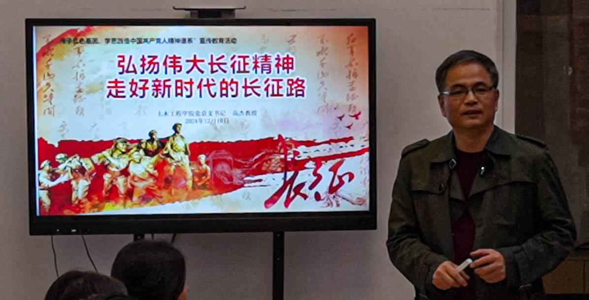 為深入學(xué)習(xí)宣傳貫徹習(xí)近平新時代中國特色社會主義思想和黨的二十屆三中全會精神,引導(dǎo)青年學(xué)生堅定馬克思主義信仰、中國特色社會主義信念、中華民族偉大復(fù)興信心,深刻領(lǐng)悟中國共產(chǎn)黨人精神譜系的豐富內(nèi)涵和時代意義,傳承紅色基因,賡續(xù)紅色血脈,2024年12月10日下午,土木工程學(xué)院黨總支書記高杰教授在福航園“一站式”學(xué)生社區(qū)思政引領(lǐng)室以“弘揚偉大長征精神,走好新時代的長征路”為題給青年學(xué)生上形勢與政策課暨專題思政課。