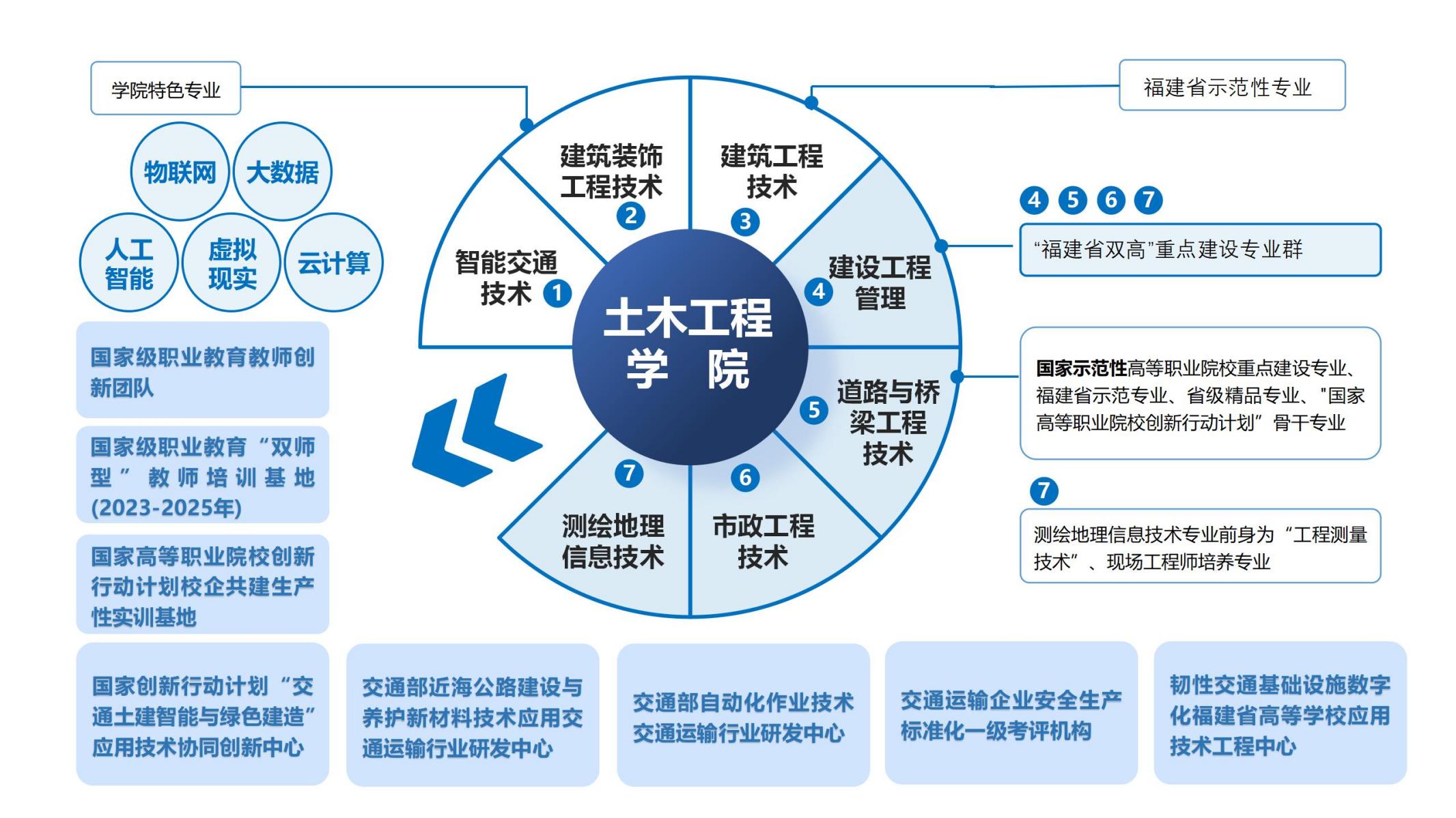 1 | 道路與橋梁工程技術(shù) | ①專業(yè)成立于1974年老牌重點(diǎn)專業(yè); ②國(guó)家級(jí)重點(diǎn)建設(shè)專業(yè)、骨干專業(yè); ③國(guó)家級(jí)職業(yè)教育教師創(chuàng)新團(tuán)隊(duì); ④省級(jí)“雙高”道路與橋梁工程技術(shù)專業(yè)群核心專業(yè); ⑤省級(jí)精品專業(yè)、省級(jí)示范性專業(yè)、省級(jí)產(chǎn)教融合專業(yè); ⑥福建省高職院校專業(yè)建設(shè)質(zhì)量評(píng)價(jià)中排名第一。 | 逢山開路,遇水架橋,筑智慧交通強(qiáng)國(guó)夢(mèng) |