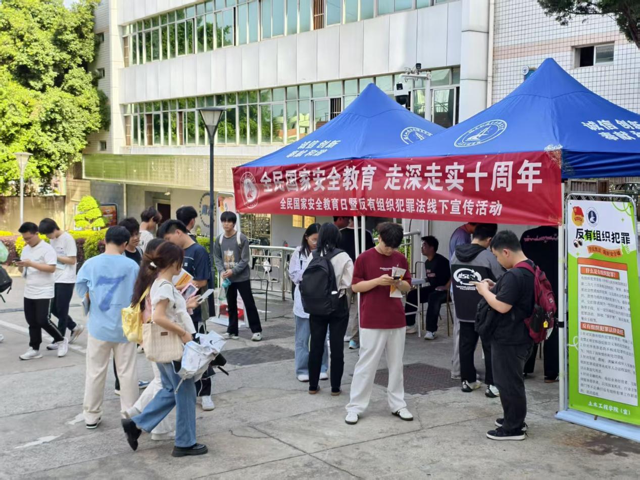2025年4月15日是第十個(gè)全民國家安全教育日,為深入學(xué)習(xí)貫徹習(xí)近平總書記關(guān)于國家安全的重要講話精神,貫徹落實(shí)總體國家安全觀,筑牢反有組織犯罪的社會(huì)防線,建設(shè)平安法治校園。4月15日,土木工程學(xué)院于福航園“一站式”學(xué)生社區(qū),開展“全民國家安全教育,走深走實(shí)十周年”全民國家安全教育日暨《反有組織犯罪法》線下宣傳活動(dòng)。