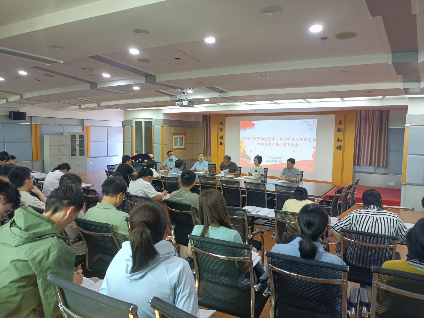 為深學(xué)細(xì)悟習(xí)近平總書記關(guān)于加強(qiáng)黨的作風(fēng)建設(shè)的重要論述和中央八項(xiàng)規(guī)定及其實(shí)施細(xì)則精神,準(zhǔn)確把握中央八項(xiàng)規(guī)定作為“鐵規(guī)矩硬杠杠”的核心要義,切實(shí)增強(qiáng)貫徹落實(shí)的思想自覺、政治自覺、行動自覺,2025年5月14日上午,土木工程學(xué)院在創(chuàng)新樓1007召開2025年從嚴(yán)治黨暨深入貫徹中央八項(xiàng)規(guī)定精神學(xué)習(xí)教育警示教育大會,學(xué)院領(lǐng)導(dǎo)班子成員、學(xué)院副科級以上干部、全體黨員、教研室主任、輔導(dǎo)員及參與“雙高”項(xiàng)目建設(shè)人員參會。