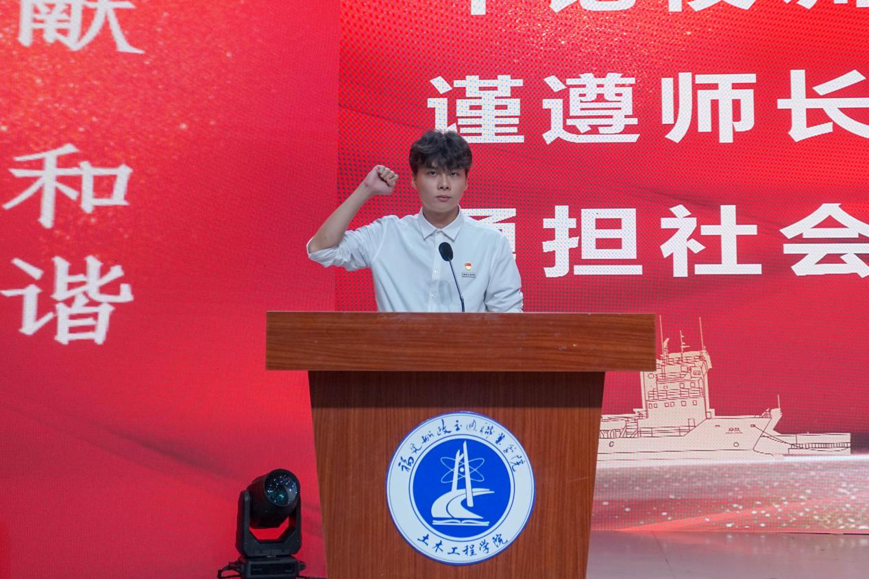 在畢業(yè)宣誓環(huán)節(jié),全體畢業(yè)生在謝劍楠同學(xué)的帶領(lǐng)下莊嚴宣誓,鏗鏘誓言展現(xiàn)出他們牢記校訓(xùn)院訓(xùn)、勇?lián)鐣?zé)任的決心。
