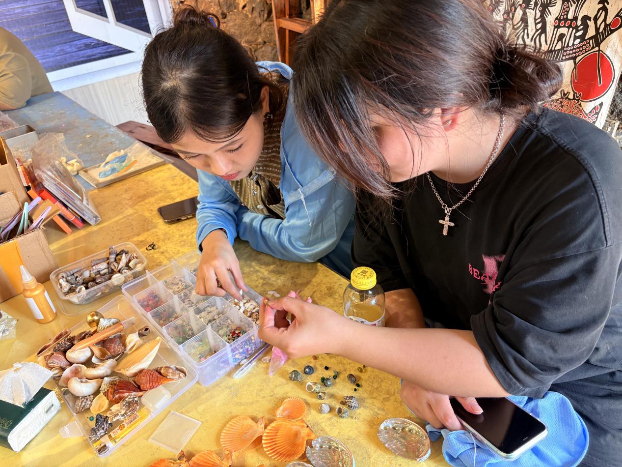 走進擁有六百余年歷史的海壇古城,仿佛穿越時空,回到了那個漁火通明、海風(fēng)輕拂的年代。實踐隊員們在這里親身體驗了貝殼彩繪、簪花制作等海洋非遺項目,每一項技藝都承載著深厚的文化底蘊和匠人的智慧。在傳承人的悉心指導(dǎo)下,學(xué)子們以螺鈿點染貝胚,用絨線編織簪花,指尖翻飛間,不僅是在制作一件件精美的手工藝品,更是在與歷史對話,與海洋文明共鳴。