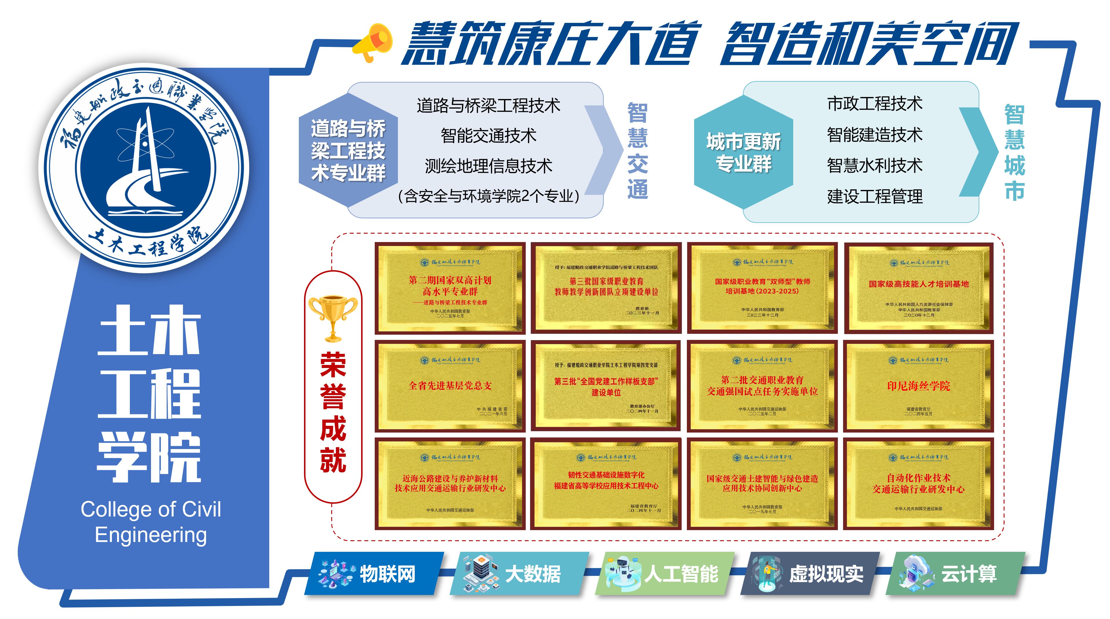 土木工程學(xué)院是全省重要的交通工程建設(shè)與管理高技能人才培養(yǎng)基地,道路與橋梁工程技術(shù)專業(yè)群入選第二期國家雙高計劃高水平專業(yè)群。現(xiàn)有國家級職業(yè)教育教師創(chuàng)新團隊、國家級交通土建智能與綠色建造應(yīng)用技術(shù)協(xié)同創(chuàng)新中心、國家級職業(yè)教育“雙師型”教師培訓(xùn)基地、國家高等職業(yè)院校創(chuàng)新行動計劃校企共建生產(chǎn)性實訓(xùn)基地、交通部自動化作業(yè)技術(shù)交通運輸行業(yè)研發(fā)中心、交通部近海公路建設(shè)與養(yǎng)護新材料技術(shù)應(yīng)用交通運輸行業(yè)研發(fā)中心,以及韌性交通基礎(chǔ)設(shè)施數(shù)字化福建省高等學(xué)校應(yīng)用技術(shù)工程中心,承擔(dān)交通運輸部第二批交通職業(yè)教育交通強國專業(yè)試點任務(wù)。自1974年開辦以來,已為行業(yè)輸送超2萬名交通土建類相關(guān)專業(yè)畢業(yè)生,為服務(wù)交通強國戰(zhàn)略,加快建設(shè)交通強國福建先行區(qū),推動福建建設(shè)交通強省、構(gòu)建海峽兩岸融合發(fā)展示范區(qū)和全國首批公路數(shù)字化轉(zhuǎn)型升級示范區(qū)提供人才支撐。