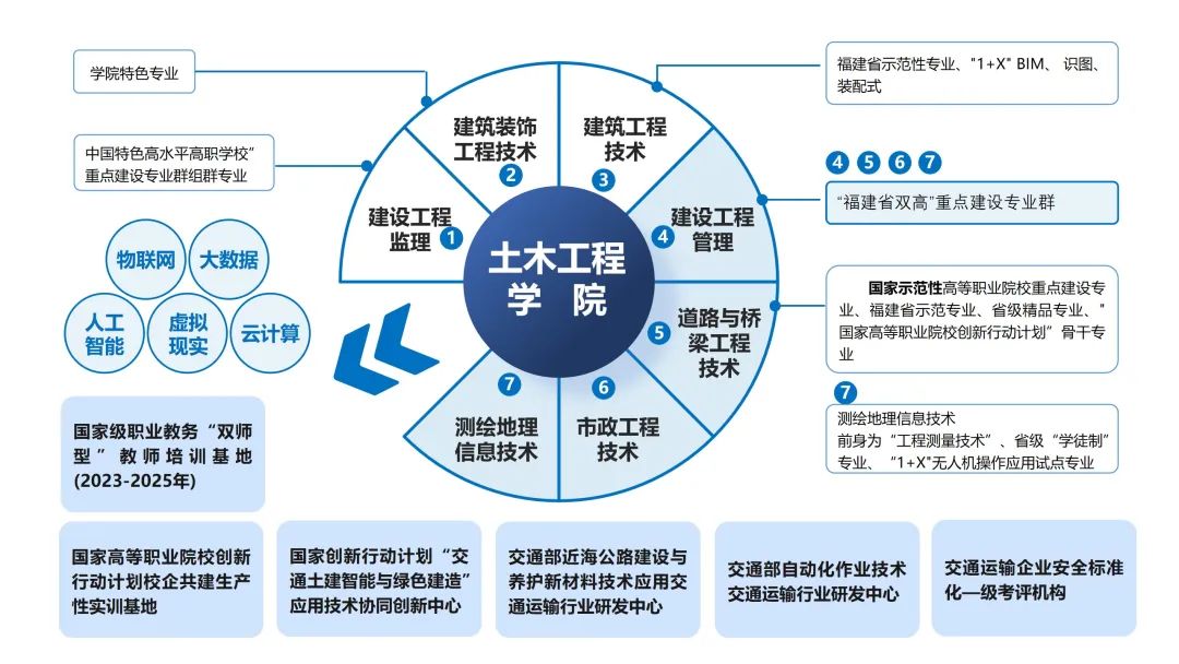 土木工程學院現(xiàn)有道路與橋梁工程技術、市政工程技術、建設工程監(jiān)理、測繪地理信息技術、建筑工程技術、建設工程管理、建筑裝飾工程技術7個專業(yè)。其中,道路與橋梁工程技術是首批國家示范性高等職業(yè)院校建設計劃中央財政重點支持建設的專業(yè)(簡稱“首批國家示范性建設重點專業(yè)”)、國家創(chuàng)新發(fā)展行動計劃骨干專業(yè)、福建省示范專業(yè)、福建省精品專業(yè),“福建省雙高”重點建設專業(yè)群的核心專業(yè),2017年通過IEET國際認證;建設工程監(jiān)理專業(yè)是“中國特色高水平高職學校與高水平專業(yè)建設計劃”(簡稱“國家雙高”)高水平專業(yè)群的組群專業(yè);市政工程技術、測繪地理信息技術、建設工程管理專業(yè)是“福建省雙高”重點建設專業(yè)群(道路與橋梁工程技術專業(yè)群)的組群專業(yè);建筑工程技術是福建省高職院校示范性專業(yè);建筑裝飾工程技術專業(yè)為學校特色專業(yè)。
