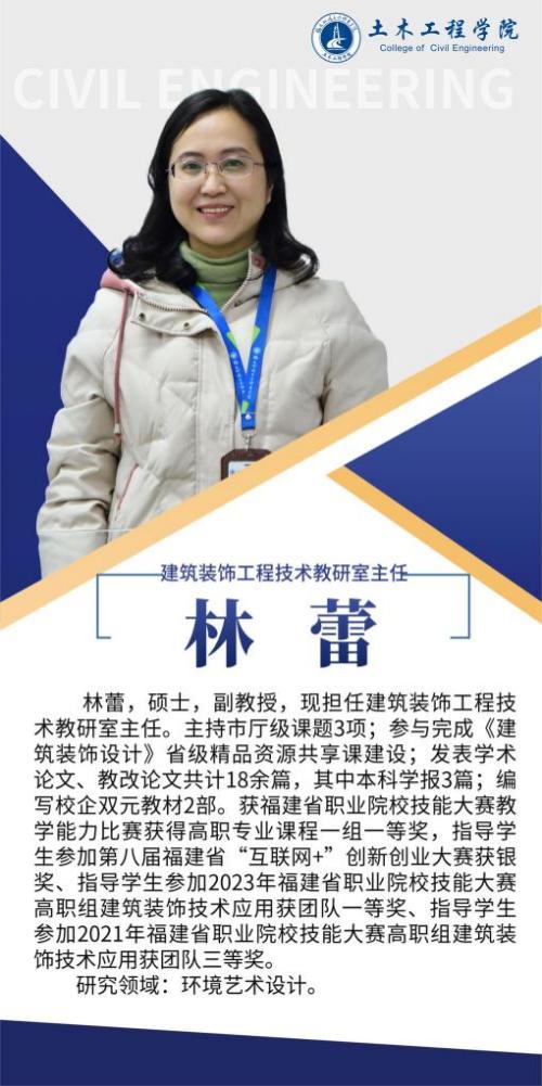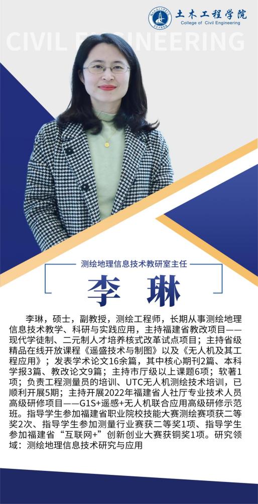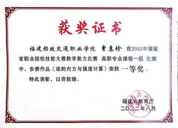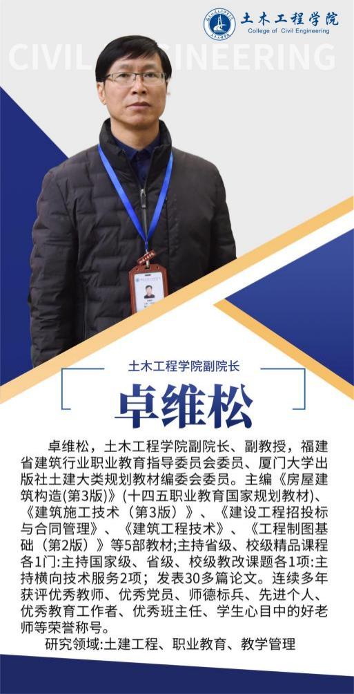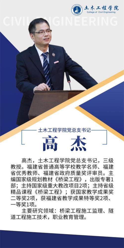 堅持黨建引領,扎實推進師資隊伍建設,土木工程學院黨總支是全省先進基層黨組織,第二支部為省級樣板支部,第四黨支部為省“雙帶頭人”教師黨支部書記工作室,并入選全國黨建工作樣板支部。土木工程學院現(xiàn)有專任教師92人,其中副教授等副高以上職稱教師55人,具有博士學位教師10人,省級教學名師1人,省優(yōu)秀教師3人,省高職高專專業(yè)帶頭人1人,專任教師中具備雙師素質的達到95%以上。另有一批專業(yè)領軍人才、大師名匠等組成的兼職教師隊伍,形成了高水平的“雙師雙能”教學團隊。在先進基層黨組織示范帶動下,道路與橋梁工程技術專業(yè)教學創(chuàng)新團隊入選第三批國家級職業(yè)教育教師創(chuàng)新團隊立項(培育)建設單位名單,團隊成員參與獲得國家級教學成果二等獎2項,福建省教學成果特等獎1項,一等獎2項,教師參加省級以上教學能力比賽獲一等獎2項,二等獎1項,三等獎5項。