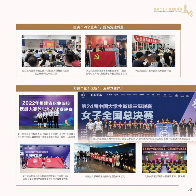 十九大以來(lái),福建船政交通職業(yè)學(xué)院堅(jiān)持以習(xí)近平新時(shí)代中國(guó)特色社會(huì)主義思想為指導(dǎo),堅(jiān)持社會(huì)主義辦學(xué)方向,深入貫徹黨的十九大和十九屆歷次全會(huì)精神,堅(jiān)守“為黨育人、為國(guó)育才”的初心和使命,慎終如始推進(jìn)學(xué)校黨的政治建設(shè)、思想建設(shè)、組織建設(shè)、作風(fēng)建設(shè)、紀(jì)律建設(shè)、制度建設(shè),黨的組織體系和學(xué)校治理體系相得益彰,黨建引領(lǐng)推動(dòng)創(chuàng)新船政、質(zhì)量船政、文化船政協(xié)奏齊鳴,政治生態(tài)、學(xué)術(shù)生態(tài)、文化生態(tài)持續(xù)向好,辦學(xué)效率、辦學(xué)效能、辦學(xué)效益顯著提升!