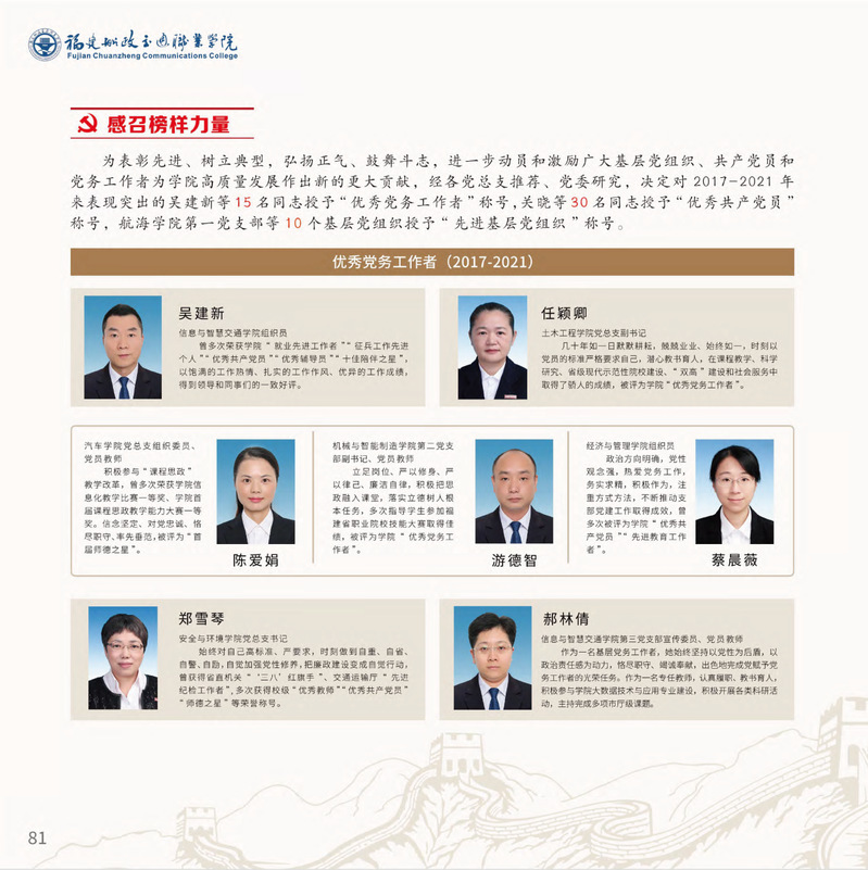十九大以來,福建船政交通職業(yè)學院堅持以習近平新時代中國特色社會主義思想為指導,堅持社會主義辦學方向,深入貫徹黨的十九大和十九屆歷次全會精神,堅守“為黨育人、為國育才”的初心和使命,慎終如始推進學校黨的政治建設(shè)、思想建設(shè)、組織建設(shè)、作風建設(shè)、紀律建設(shè)、制度建設(shè),黨的組織體系和學校治理體系相得益彰,黨建引領(lǐng)推動創(chuàng)新船政、質(zhì)量船政、文化船政協(xié)奏齊鳴,政治生態(tài)、學術(shù)生態(tài)、文化生態(tài)持續(xù)向好,辦學效率、辦學效能、辦學效益顯著提升!