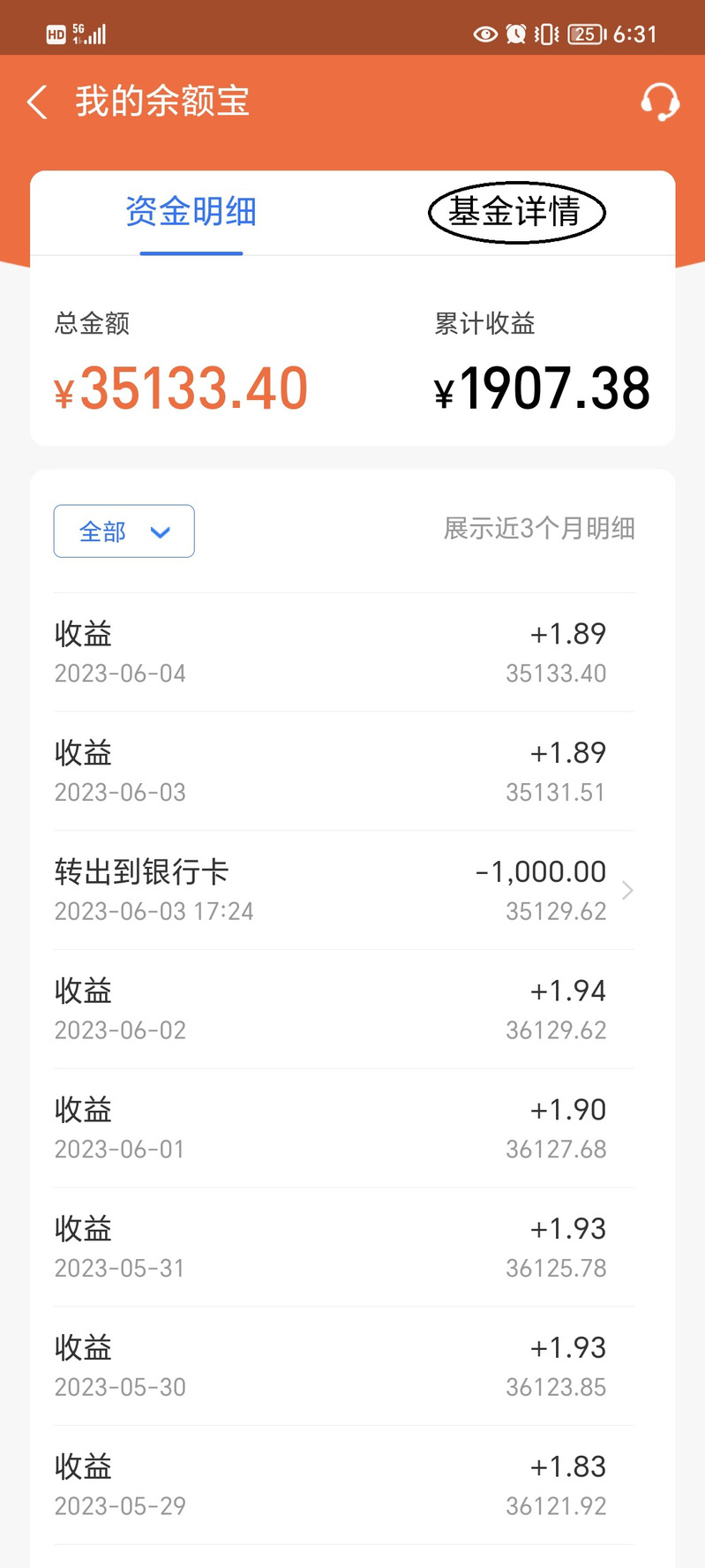 進(jìn)入我的余額寶頁面,點擊“基金詳情”。