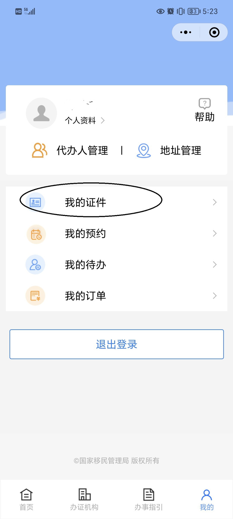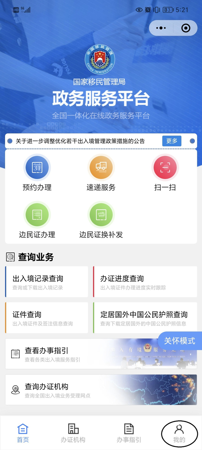 進(jìn)入“移民局”小程序后,點擊右下角“我的”。