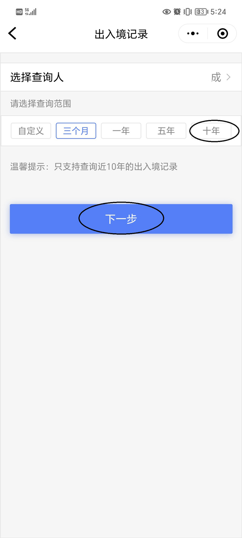 進(jìn)入“出入境記錄查詢”后,可選擇所需查詢時間段(當(dāng)前支持查詢近10年內(nèi)的出入境記錄),選好后點擊“下一步”,點擊“查詢”,可查到本人的出入境記錄。