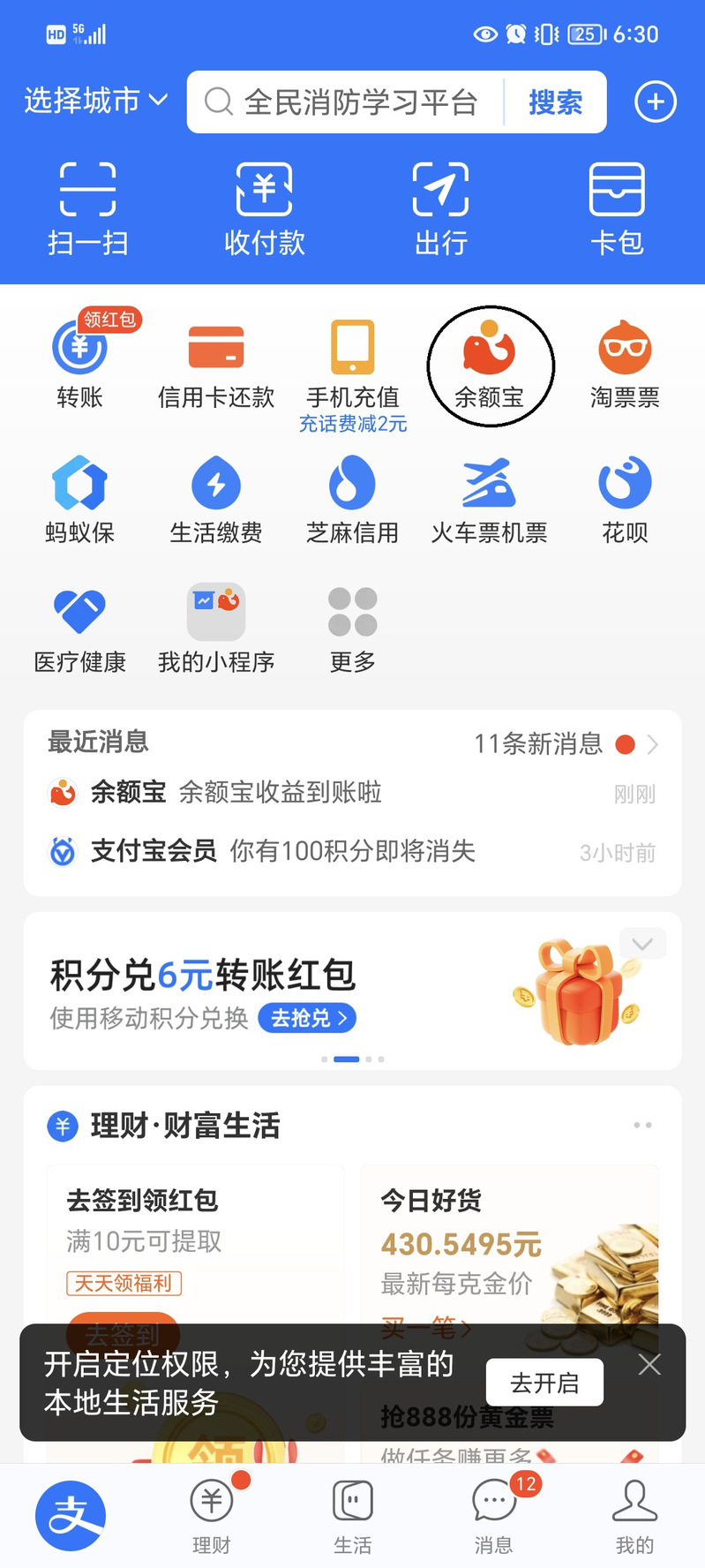 打開支付寶首頁,點擊“余額寶”。