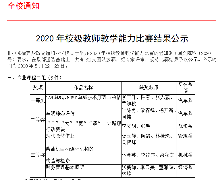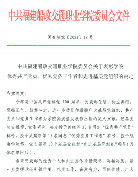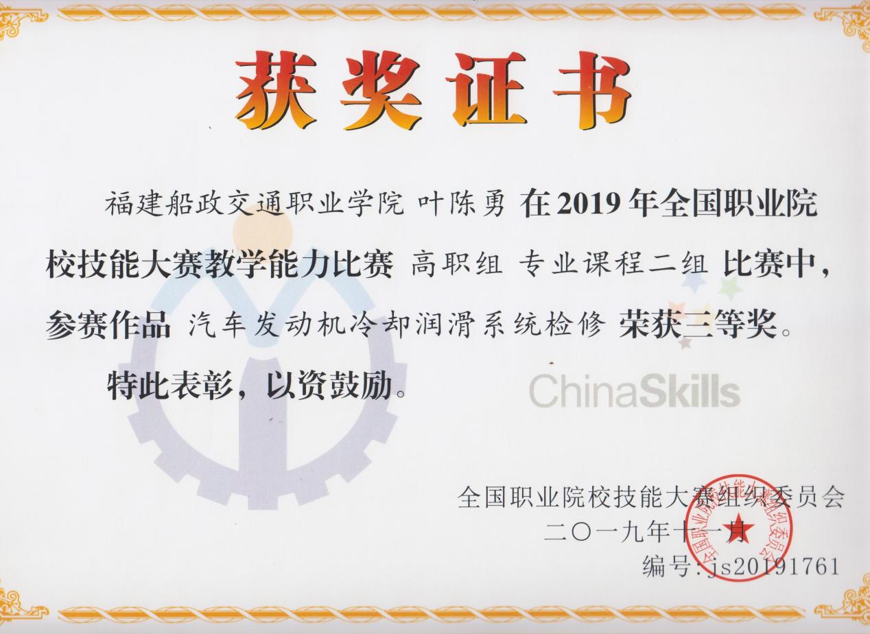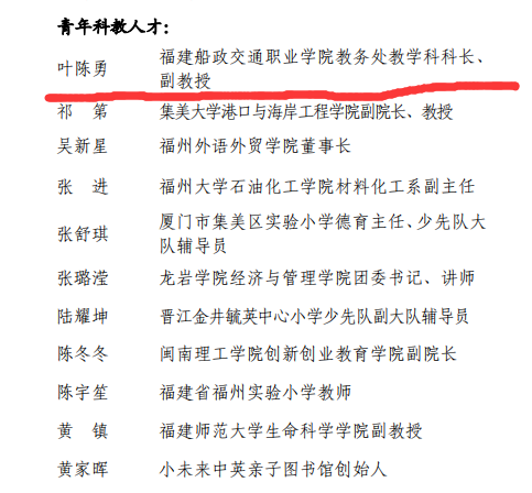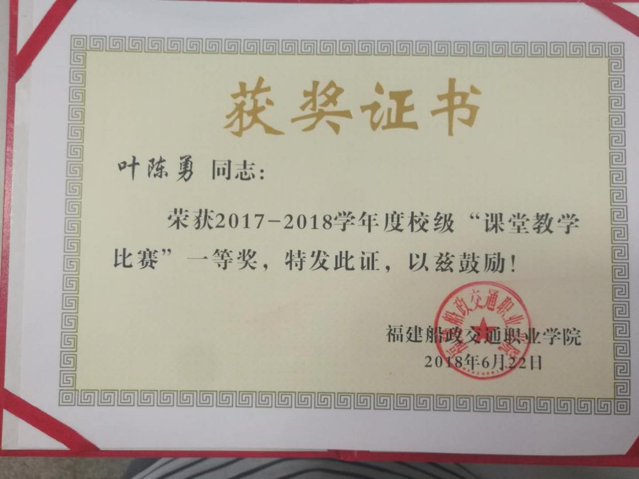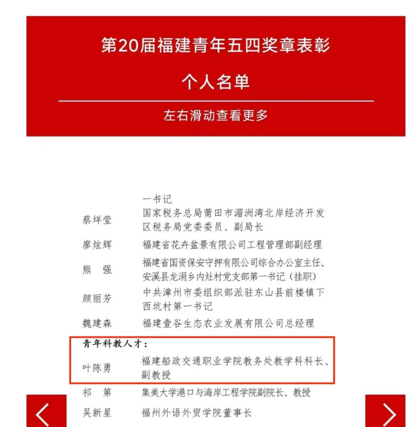 葉陳勇,福建船政交通職業(yè)學(xué)院教務(wù)處黨支部,男,1987年12月出生,2007年12月入黨,現(xiàn)任福建船政交通職業(yè)學(xué)院教務(wù)處教學(xué)科科長(zhǎng)(副教授)。曾擔(dān)任汽車(chē)制造與裝配技術(shù)專業(yè)負(fù)責(zé)人,分赴加蓬共和國(guó)援教、中國(guó)教育會(huì)計(jì)學(xué)會(huì)高等職業(yè)院校分會(huì)掛職。曾獲加蓬共和國(guó)國(guó)家嘉獎(jiǎng)狀,福建省第20屆五四青年獎(jiǎng),“最美逆行者”,全國(guó)職業(yè)院校教師教學(xué)能力比賽二等獎(jiǎng)、三等獎(jiǎng),省教師教學(xué)能力比賽一等獎(jiǎng)、二等獎(jiǎng),省技能大賽一等獎(jiǎng)指導(dǎo)教師,建黨100周年之際校優(yōu)秀共產(chǎn)黨員,校首屆五四青年獎(jiǎng),校優(yōu)秀教師,校優(yōu)秀教育工作者,校級(jí)教學(xué)成果獎(jiǎng)一二等獎(jiǎng)等。