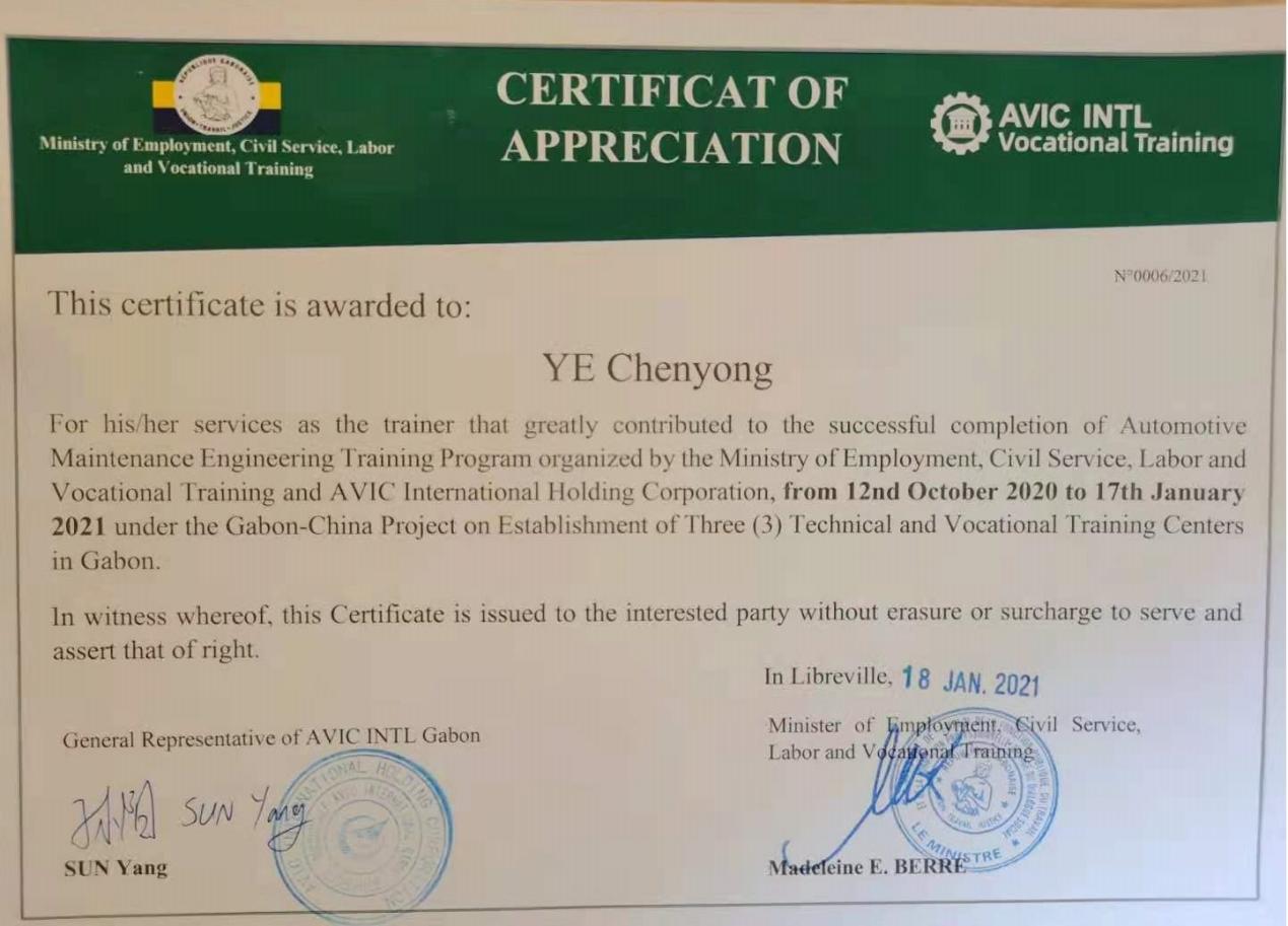 138天來(lái),我們夜以繼日,通過(guò)教學(xué)方式和理念的創(chuàng)新,逐一攻堅(jiān)克難,解決困難,砥礪奮戰(zhàn),于2021年1月17日順利完成加蓬職教項(xiàng)目。畢業(yè)典禮時(shí),加蓬國(guó)家的教育部、科技部、勞工部領(lǐng)導(dǎo)都來(lái)到了現(xiàn)場(chǎng),給予我們高度評(píng)價(jià),并授予我們加蓬國(guó)家嘉獎(jiǎng)狀,這是我校獲得的首個(gè)國(guó)際嘉獎(jiǎng)。