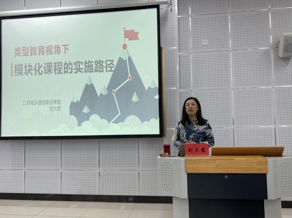 江蘇城鄉(xiāng)建設(shè)職業(yè)學(xué)院教育技術(shù)與信息中心主任、全國教師教學(xué)能力大賽評審專家劉大君以《類型教育視角下模塊化課程的路徑》為題,從課程的模塊化改革、模塊化課程的設(shè)計、項目式教學(xué)的實施等三部分內(nèi)容分析授課,結(jié)合教師教學(xué)能力大賽精典案例,給了我院教學(xué)創(chuàng)新團(tuán)隊教師極大的啟發(fā)。