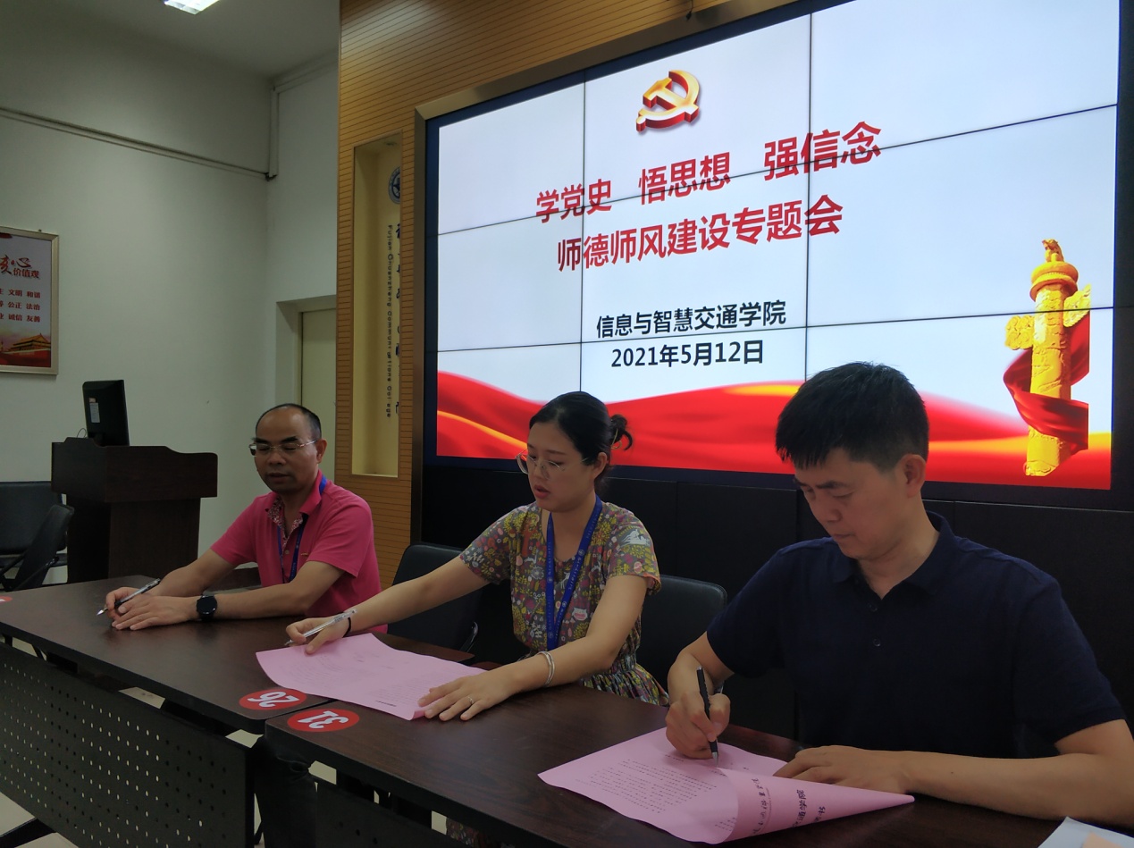 會上,學(xué)院總支書記許友孝帶領(lǐng)全體老師們認真閱讀了《信息與智慧交通學(xué)院師德師風(fēng)承諾書》的各項內(nèi)容,強調(diào)堅決不觸碰師德紅線,做一個遵守紀律的老師。最后每位老師鄭重地在《信息與智慧交通學(xué)院師德師風(fēng)承諾書》上簽下了自己的名字。